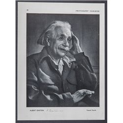 Einstein, Albert. Page from Photography Year-Book with the famous Einstein portrait by Yousuf Karsh signed "A. Einstein - 55," in the lowe...