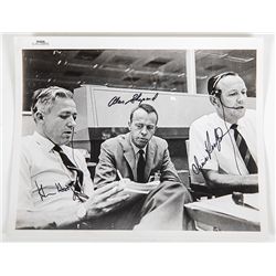Alan Shepard Autograph - Early Mission Control Photo. Alan Shepard with Chris Kraft and John Hodge in mission control moments after a postponement of