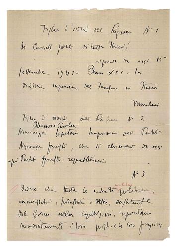 Title: MANUSCRIPT OF THE GOVERNMENT ORDER ISSUED BY MUSSOLINI on 15 th September, 1943 - Author: - written in ink on two foolscap leaves - - - Quality: - The order was issued over the radio of Hitler’s Headquarters in Rastenburg, after Mussolini’s l