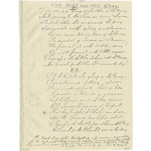 <B>Manuscript Poem, "The Blue and The Gray",</B></I> by James M. Dalzell, four pages, 6.5" x 8.75", ca. late 19th century. This document is in the author's hand and copies a work he had formerly published in February, 1867. Dalzell explains on the last page of this manuscript that the poem was originally written "<I>…in response to a Southern poem of that title which celebrated the decoration alike of some graves of both Blue and Gray by a lady in the South…</B></I>" He personally would have nothing to do with honoring Confederate dead and lobbied successfully to have separate "decoration days" for both sides. Today's national Memorial Day and regional Confederate Memorial Days originated in the immediate post-Civil War controversy over just how the nation should remember her lost sons. In excellent condition and bound with archival tape along the left margin. <I>Ex. Henry E. Luhrs Collection.</B></I><BR><BR><BR><b>Shipping:</b> Flat Material, Small (<a target="_blank" href="http://www.heritageauctions.com/common/shipping.php">view shipping information</a>)