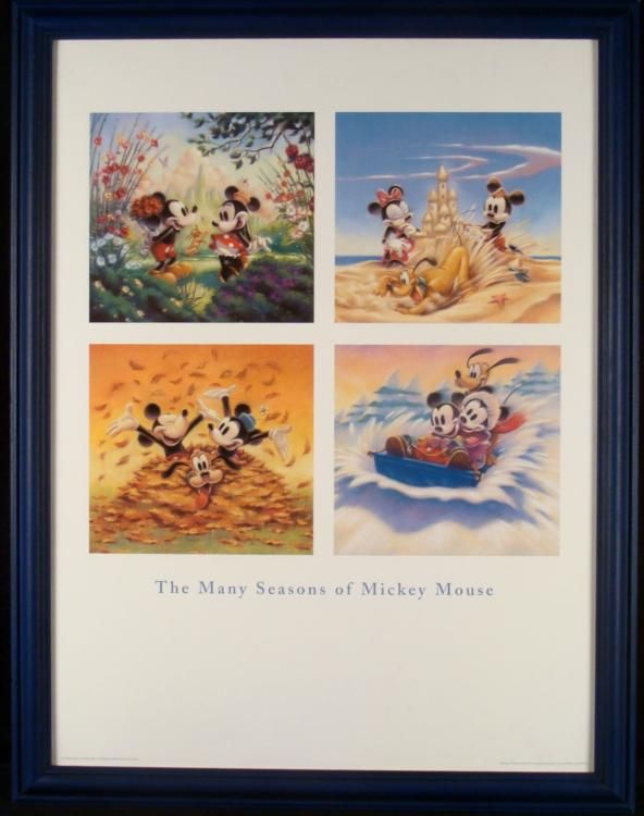 Here is nice big poster of Mickey, Minnie and Pluto, sharing joyous moments in season. These cheerful scenes are sure to brighten your day whatever season it is. * Image size: 23 1/2 x 31 1/2 inchesFraming: In blue finish wooden frameFrame size: 27 1/4 x 35 1/4 inchesPublisher: Walt Disney Art Classics Condition: Excellent