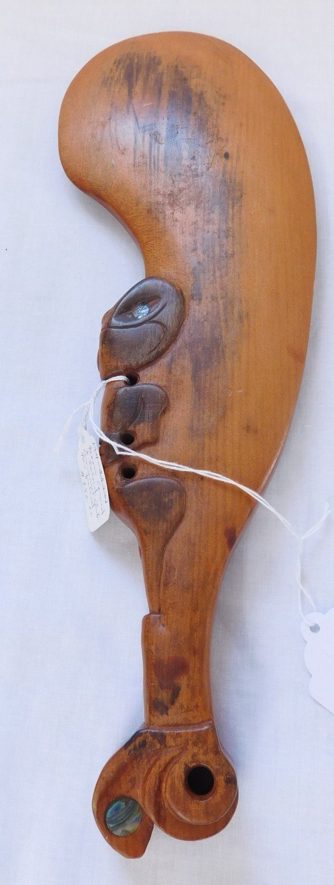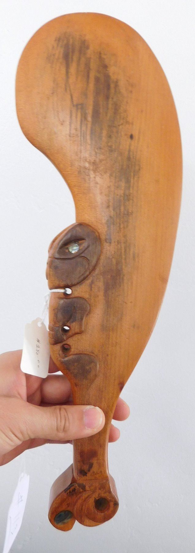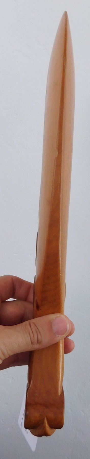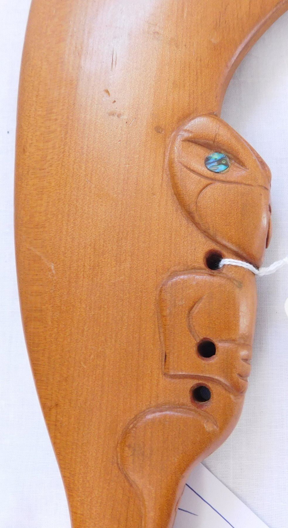 Maori Ceremonial Club, circa 1920s. Made of wood with shell inlay, the item measures 16" x 5" x 1.5". New Zealand. Shell inlay on this nice club. Condition: Minor wear, see images. Shipping: $32.50 w/insurance and signature, due to length.
