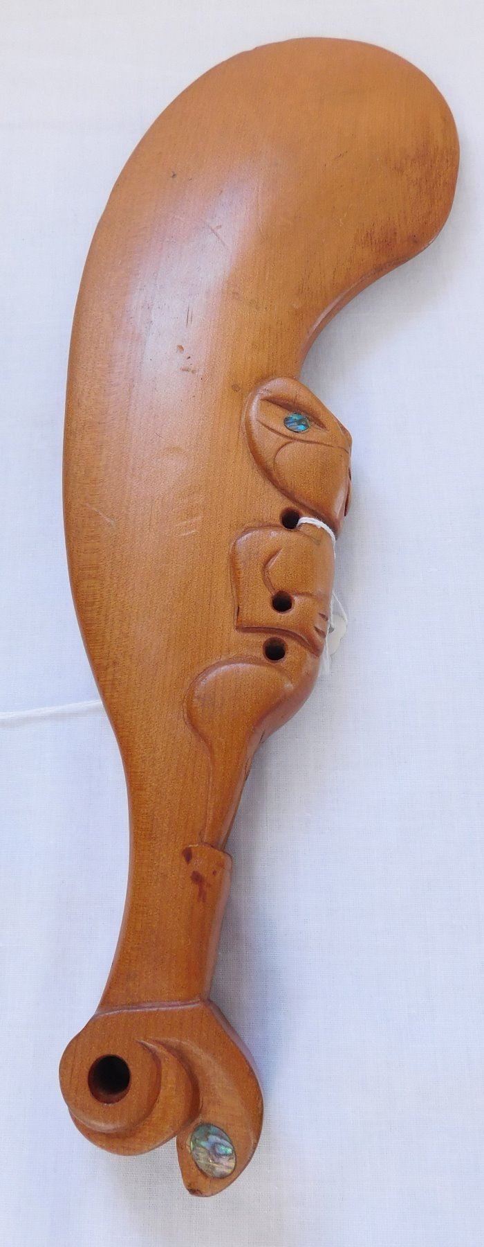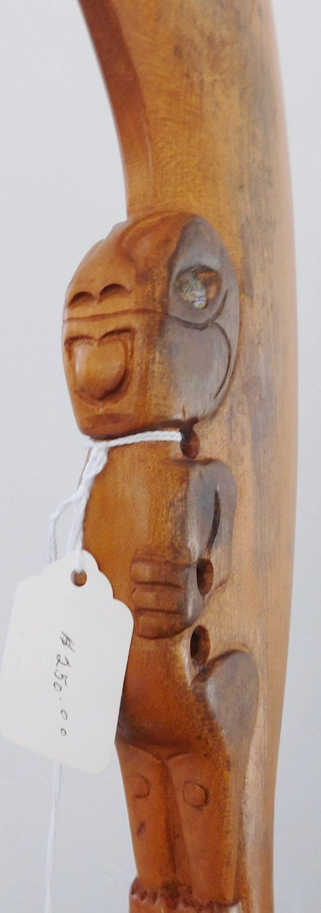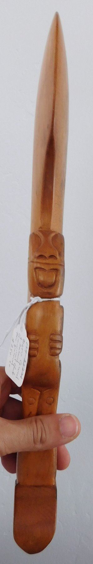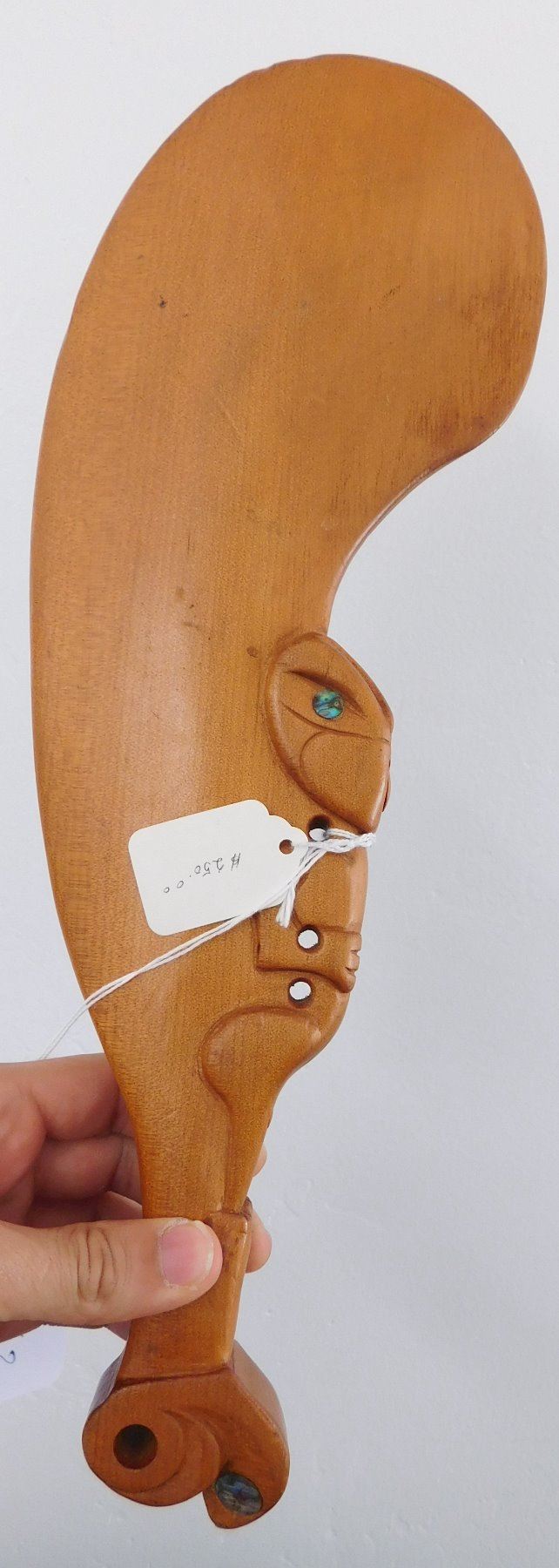Maori Ceremonial Club, circa 1920s. Made of wood with shell inlay, the item measures 16" x 5" x 1.5". New Zealand. Shell inlay on this nice club. Condition: Minor wear, see images. Shipping: $32.50 w/insurance and signature, due to length.