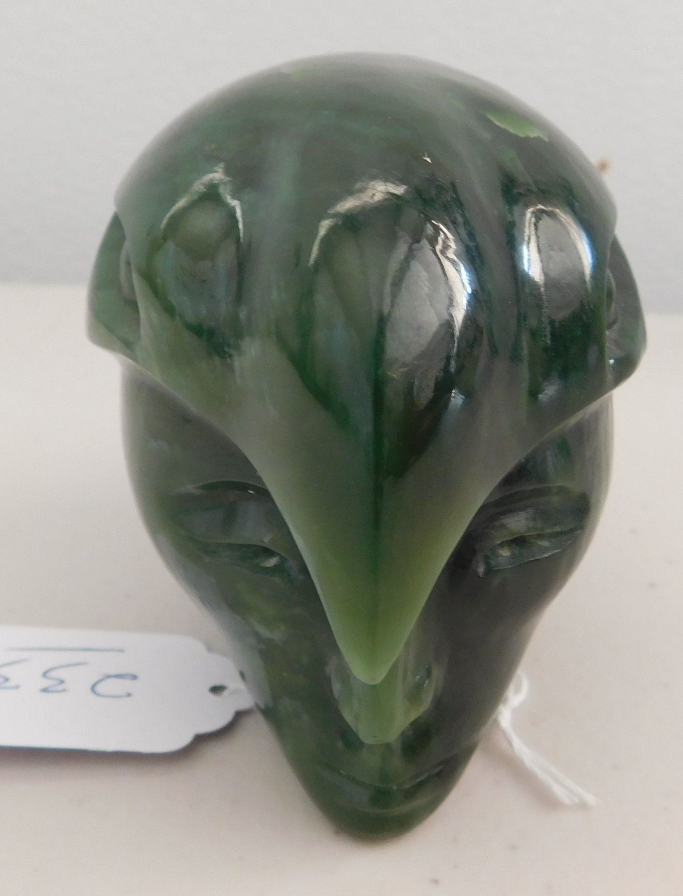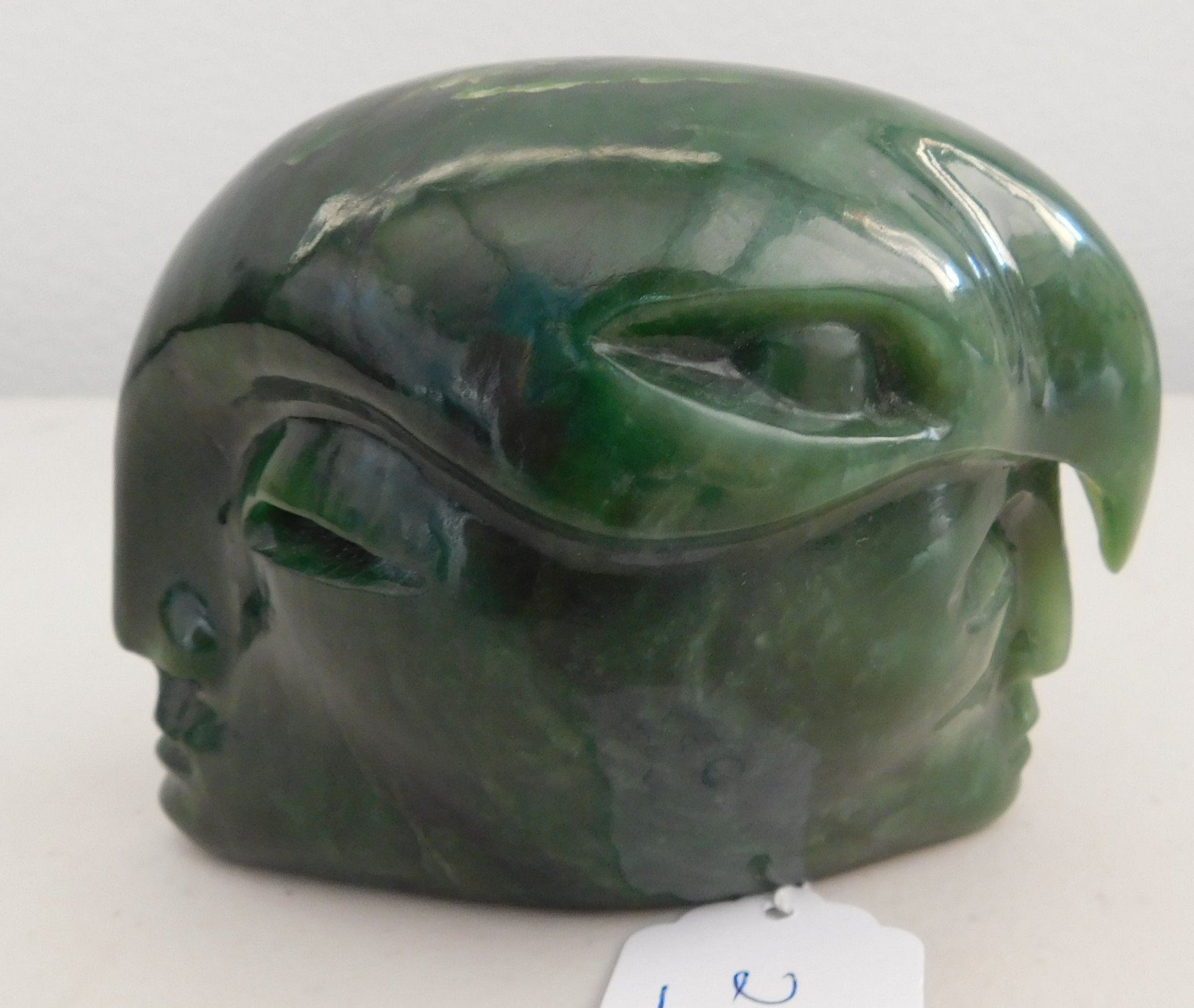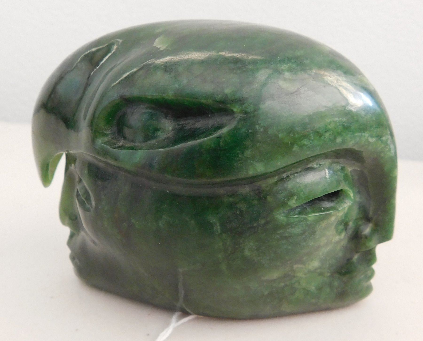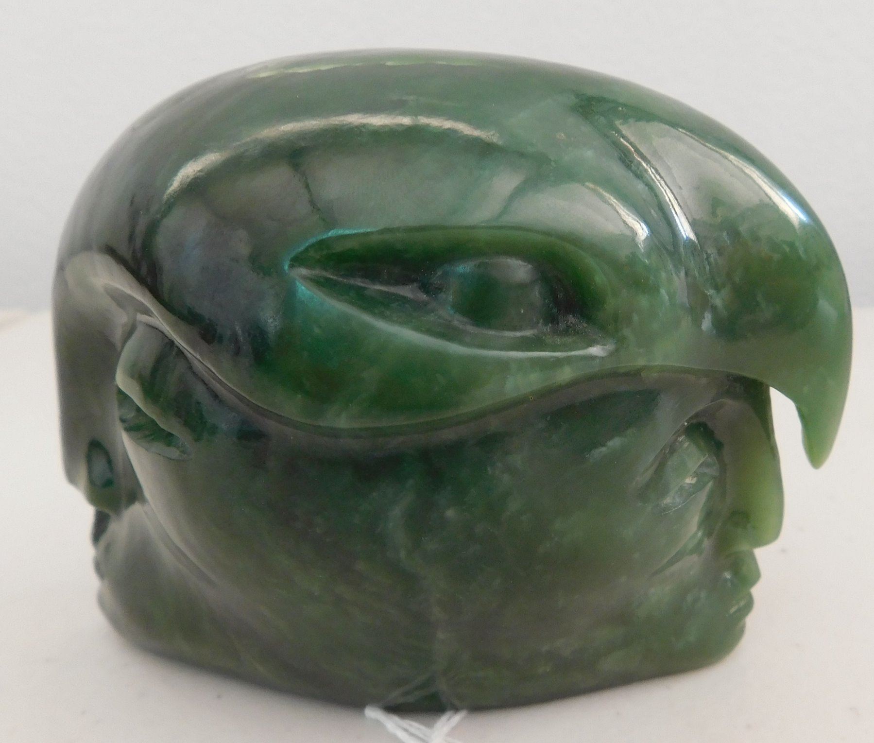 Maori Jade Carving, c. 1970s. Made of translucent green jade, the item measures 4" x 3" x 2.75". Maori, New Zealand. Double-effigy carving with raven-like bird on top. Condition: Good, see images. Shipping: $14.50 w/insurance and signature.