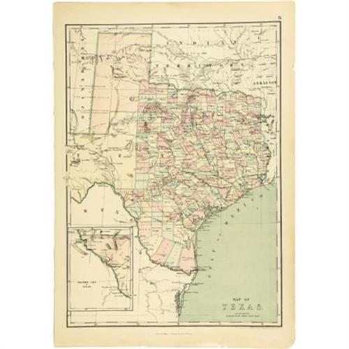 <B>1873 Map of Texas</B></I> , 13.5' x 19.5" overall, image 12.25" x 17". J. David Williams, New York, Boston & Chicago [c. 1873]. Full color lithograph. Numbered "<I>15</B></I>" (in the upper right) from an American and French "Jones and Hamilton" atlas. "<I>Imprimerie de Ferd. Mayer et fils, New York et Paris</B></I>." in lower right. Polar projection. Inset map of the western part of Texas. Excellent detail of Cross Timbers (called "<I>Mesquite Openings</B></I>), trails, ponds, springs, topography, dozens of forts, resources (gypsum, salt, arable land, timber, sand, course grass, etc.), the railroads branching from Houston/Harrisburg area, many place names such as El Paso del Norte, Old Rock Fort in Johnson Co., New Washington east of Houston, Webbers Prairie near Austin. "<I>Scale of English Miles</B></I>." Most of these maps have a map of Indian Territory on verso; this one doesn't. One minor smudge in an uncolored area just west of Edwards county. Chipped at blank edges. Fine condition.<BR><BR><b>Shipping:</b> Flat Material, Large (<a target="_blank" href="http://www.heritageauctions.com/common/shipping.php">view shipping information</a>)