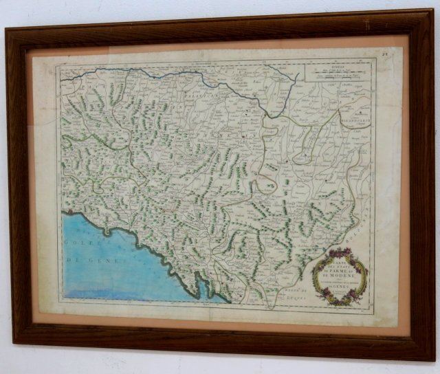 Hand colored. P. Santinia, 1729, Venice, Italy. Approx. 20" H x 28" W unframed, 25" H x 33" W framed. Broken glass.