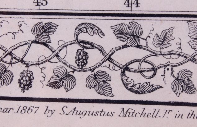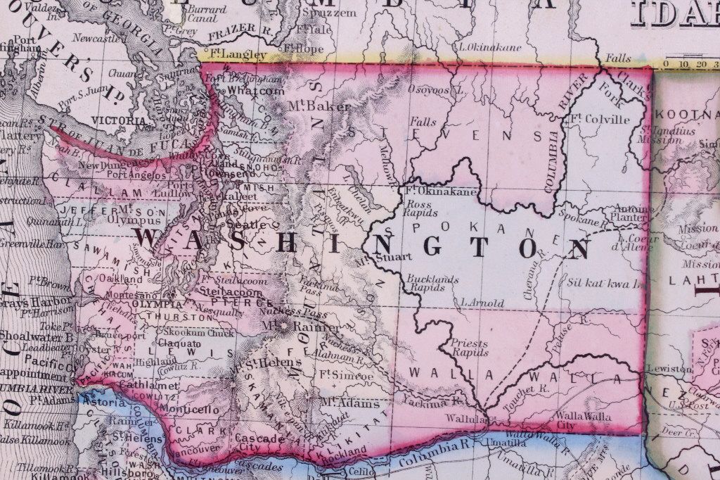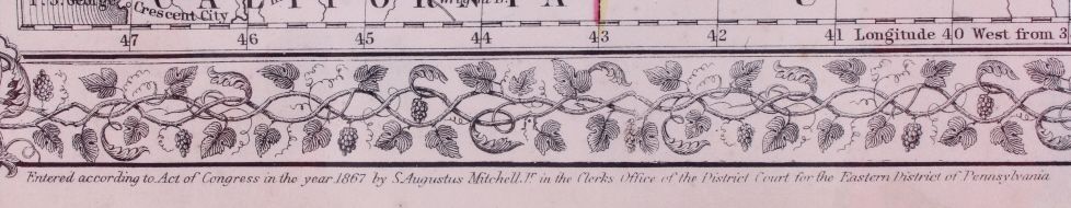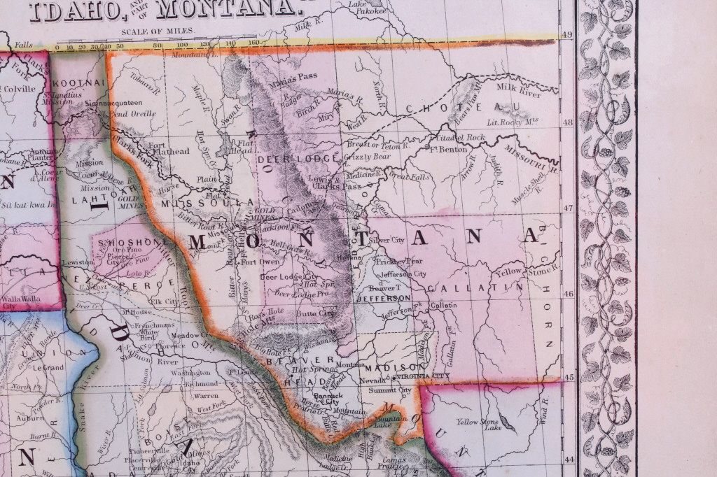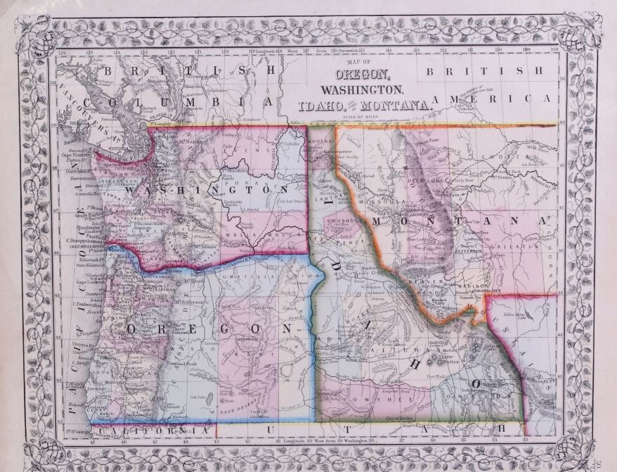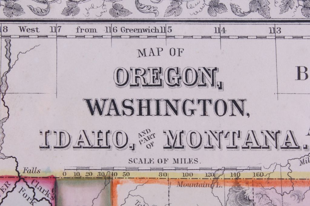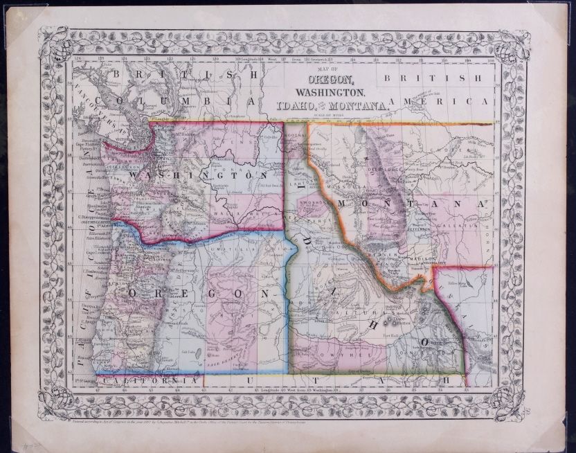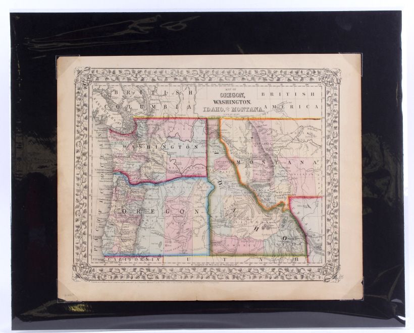 This is an 1867 hand colored map titled, "Map of Oregon, Washington, Idaho, and part of Montana." "Entered according to Act of Congress in the year 1867 by S. Augustus Mitchell in the Clerks Office of the District Court for the Eastern District of Pennsylvania." Created by Mitchell, S. Augustus (Samuel Augustus), 1792-1868. This is a hand colored very early rare Montana and Western map. The piece is on black matte board covered in plastic. Map measures 12.5"x15 3/8"