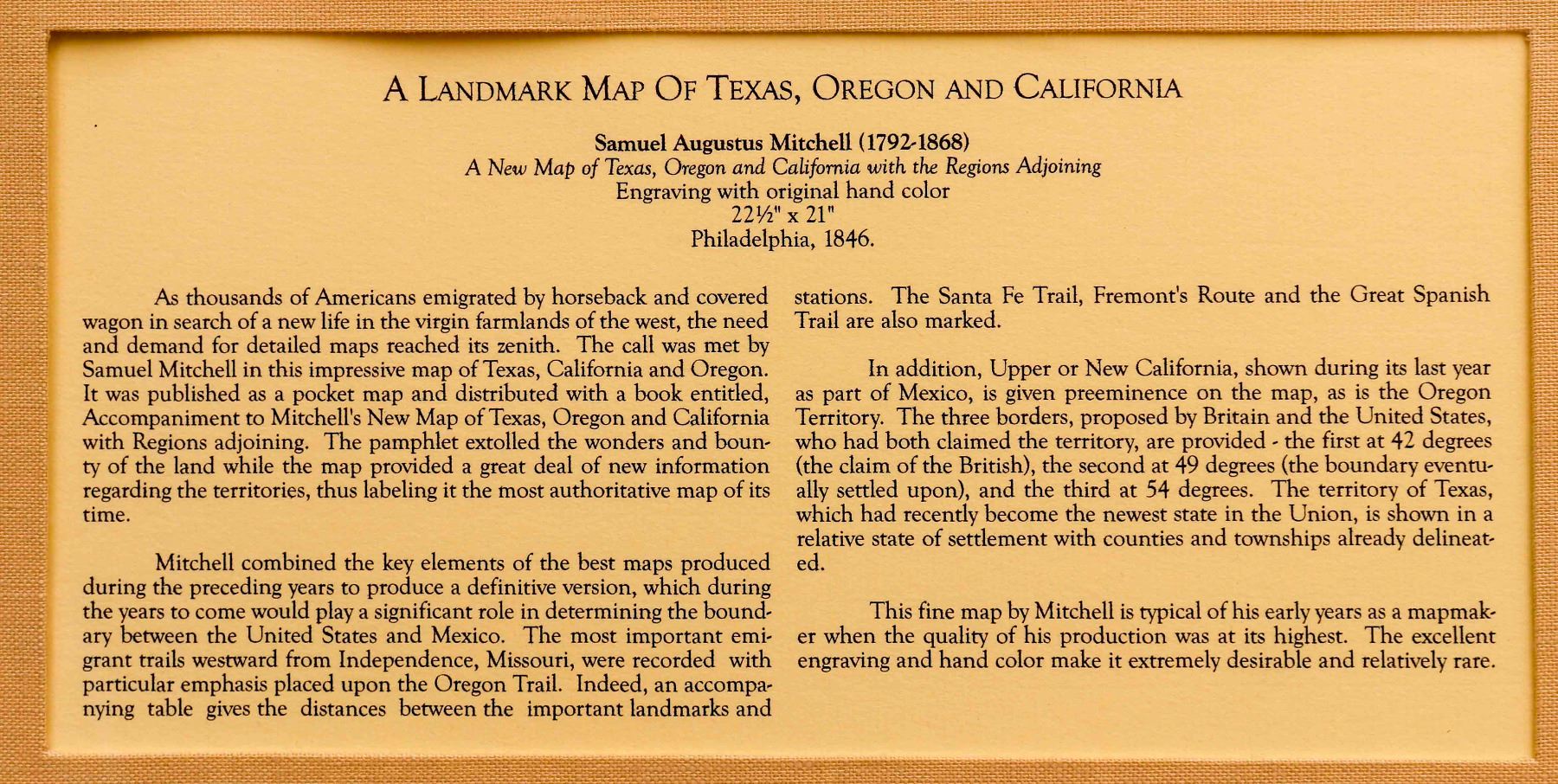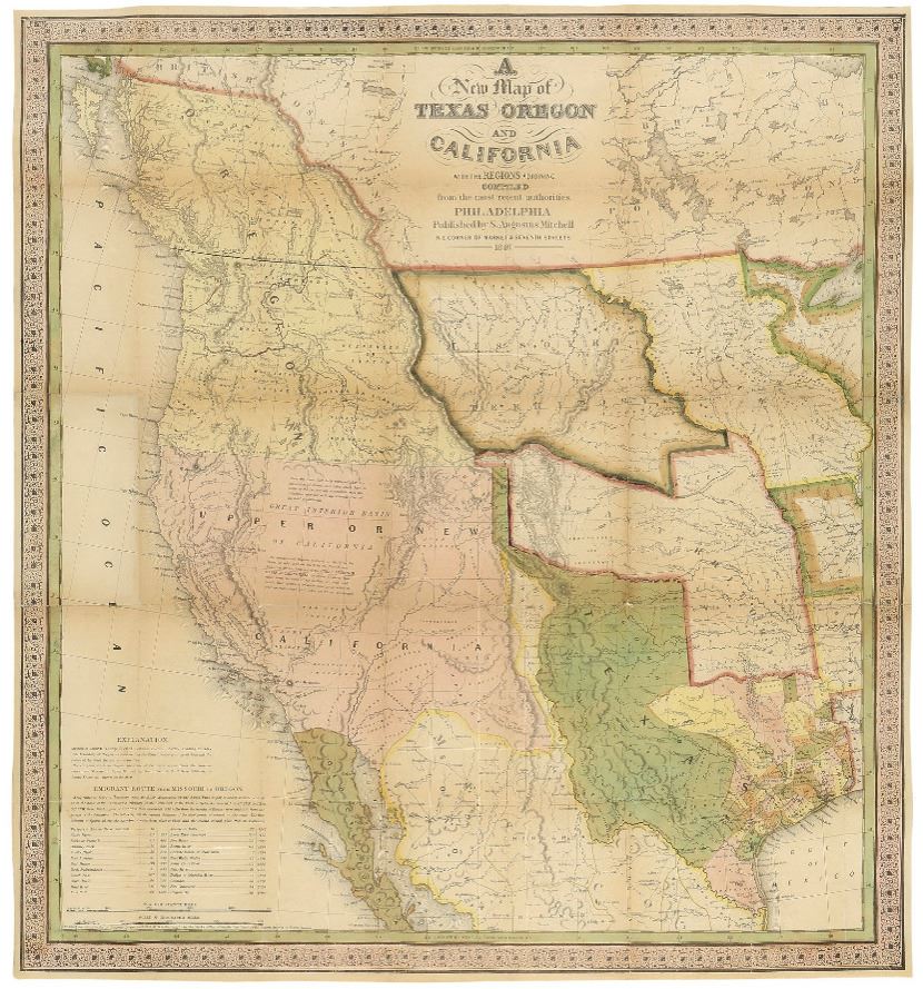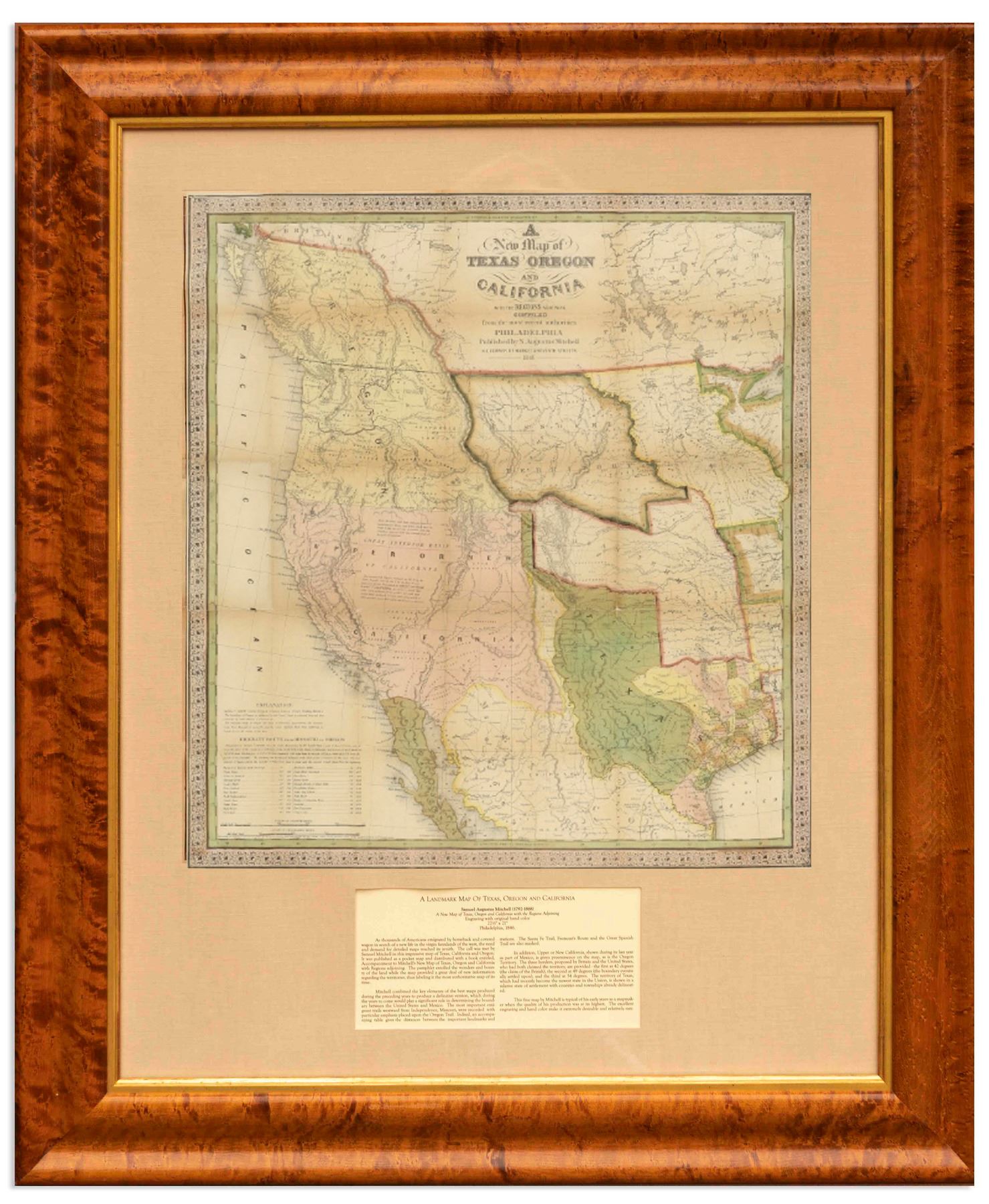 ''A New Map of Texas Oregon and California with the Regions Adjoining. Compiled from the most recent authorities.'' By cartographer Samuel Augustus Mitchell, published in 1846 as a pocket map, and considered the definitive map for settlers in the nation's westward expansion during the Gold Rush. Philadelphia: Published by S. Augustus Mitchell, 1846. With contemporary hand-coloring, folding map by engraver H.N. Burroughs was Mitchell's most important map, considered the defacto standard and thereby affecting subsequent maps of the area. It was the first to include recent explorations in the Great Basin, with boundary lines of Rio Grande to the south, and Oregon to the north at 54 degrees 40 minutes, above which are ''British Possessions''. An inset to lower left entitled ''Emigrant Route from Missouri to Oregon'', provides the distance between western cities and landmarks, undoubtedly aiding weary travelers. With decorative scrollwork along the margins, map measures 21'' x 22.5'' unfolded, nicely matted and framed to a size of 34.5'' x 41.5''. Some expert repair at fold separations and mild fading, overall in very good condition.