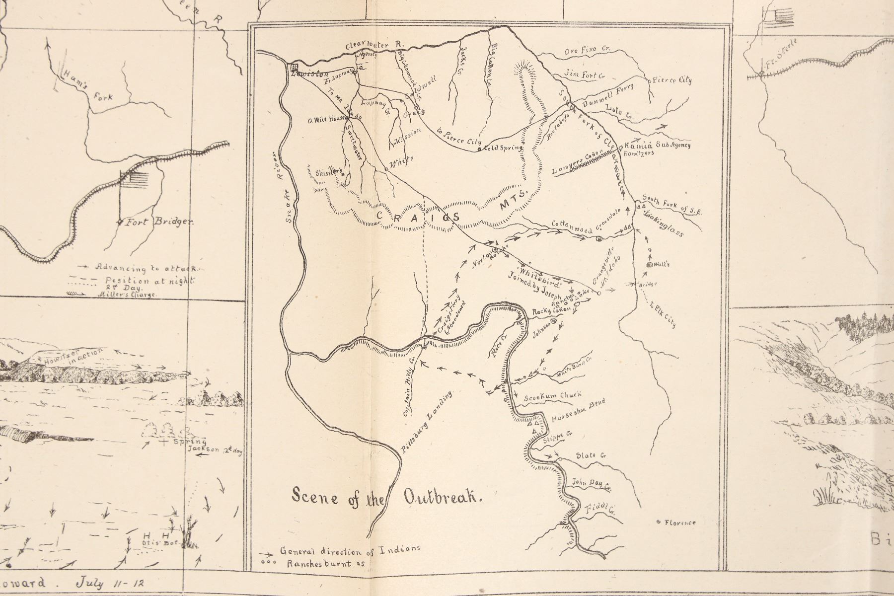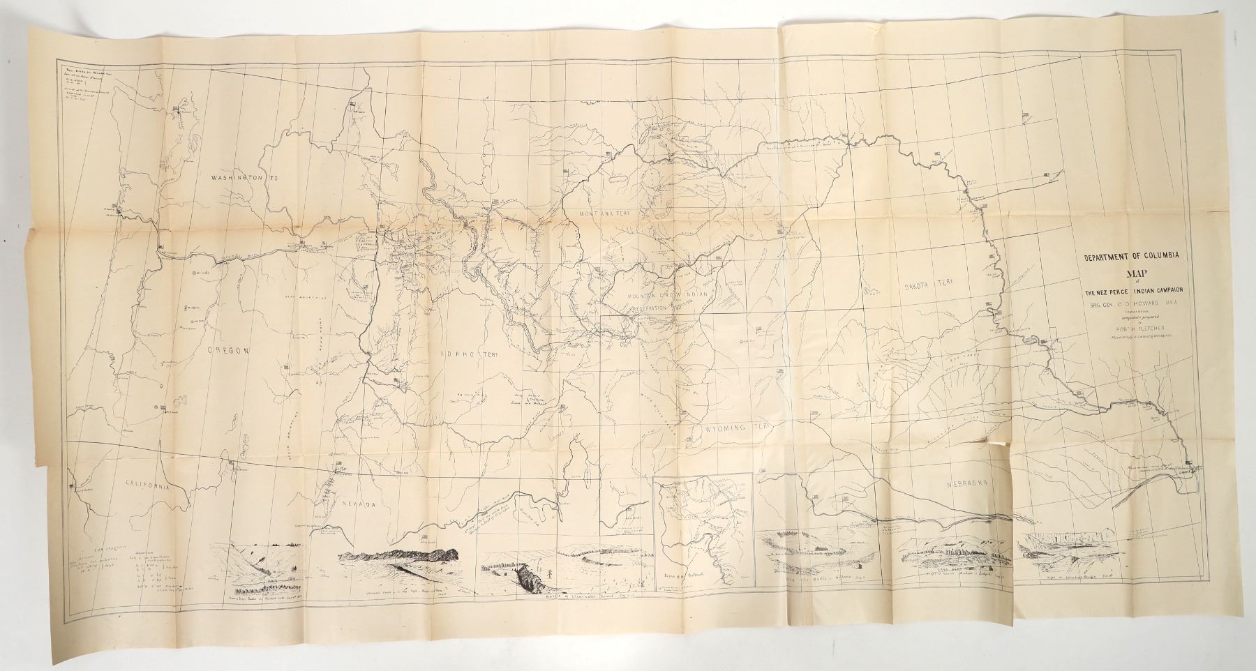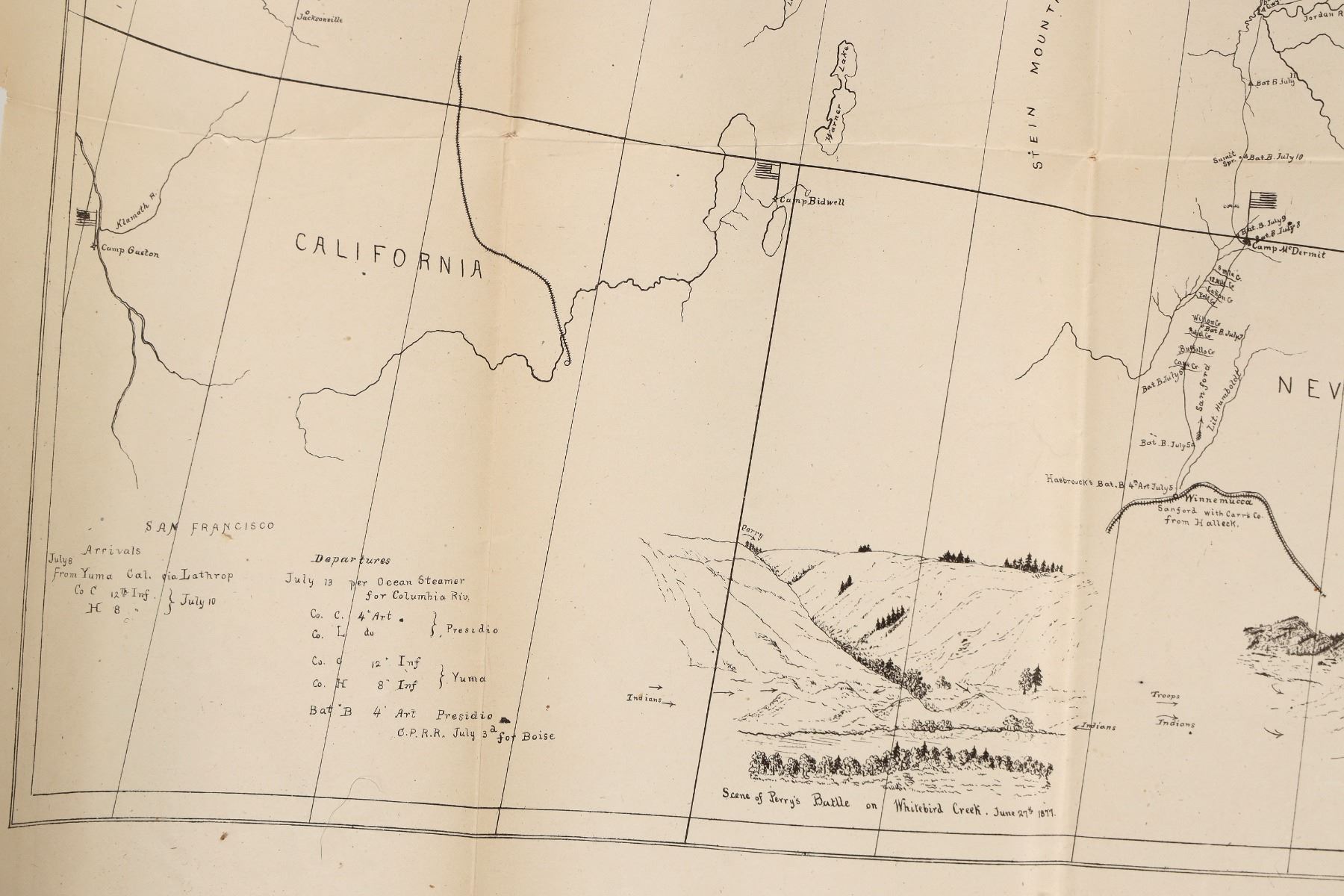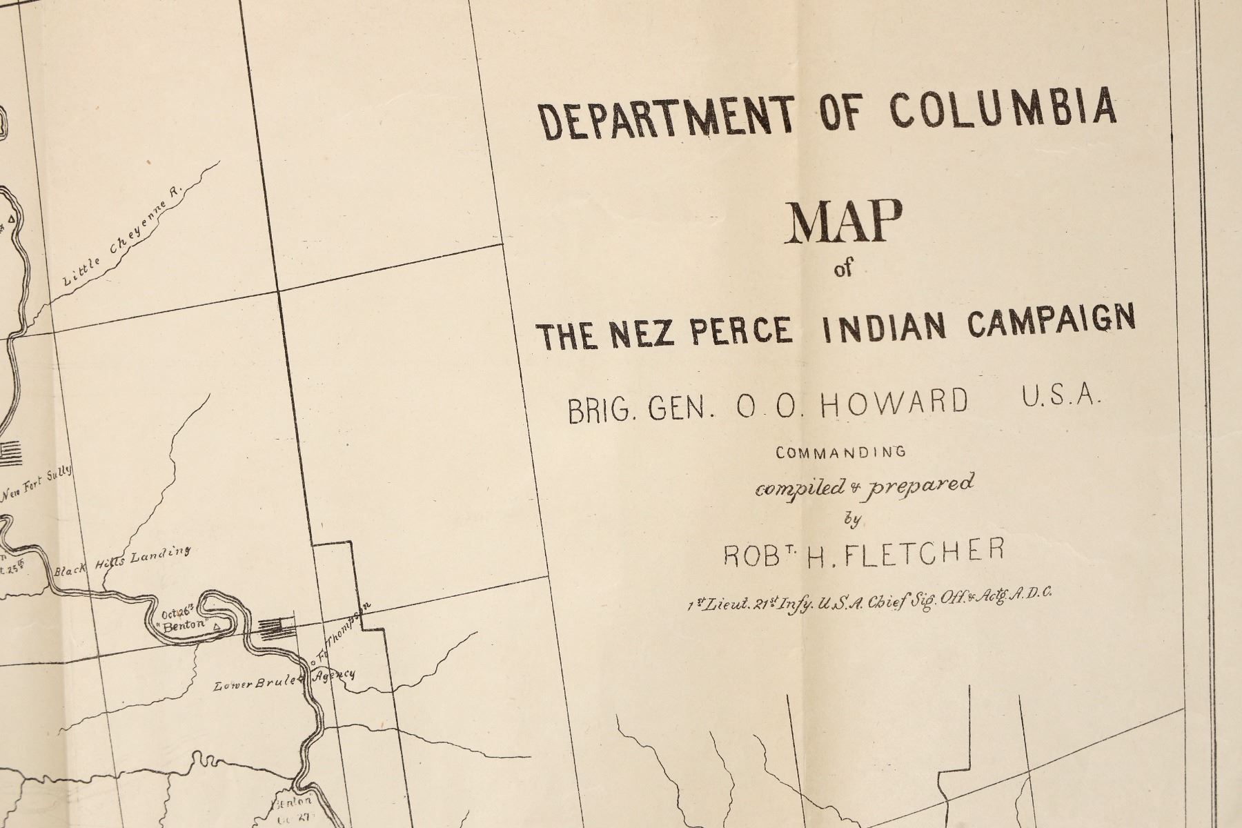 This is a military map of the Nez Perce Indian Campaign of 1877 to place the Nez Perce tribe on a reservation. The map was compiled by 1st. Lieut. Robert H. Fletcher Signal Officer for Gen. Howard. It outlines campaign locations and dates. It beautifully details the trail between California, Oregon, Washington T., Nevada, Idaho T., Montana T., Dakota T., Wyoming T. Nebraska. The map depicts all major forts of the western region and locates Custer's Battle at the Little Bighorn from a year earlier. At 24 in. X 47 in. Very well detailed with sketch illustrations of the terrain of several battles scenes. Slight yellowing at one fold crease, one tear at a fold lower right. Suitable for framing. Please see photo for details.