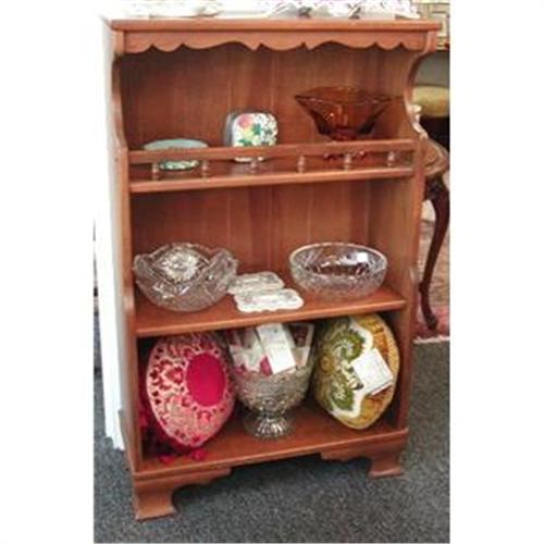Great petite maple chippendale style open bookcase. Three shelves. First shelf has railing in front. Original finish. Very sturdy!