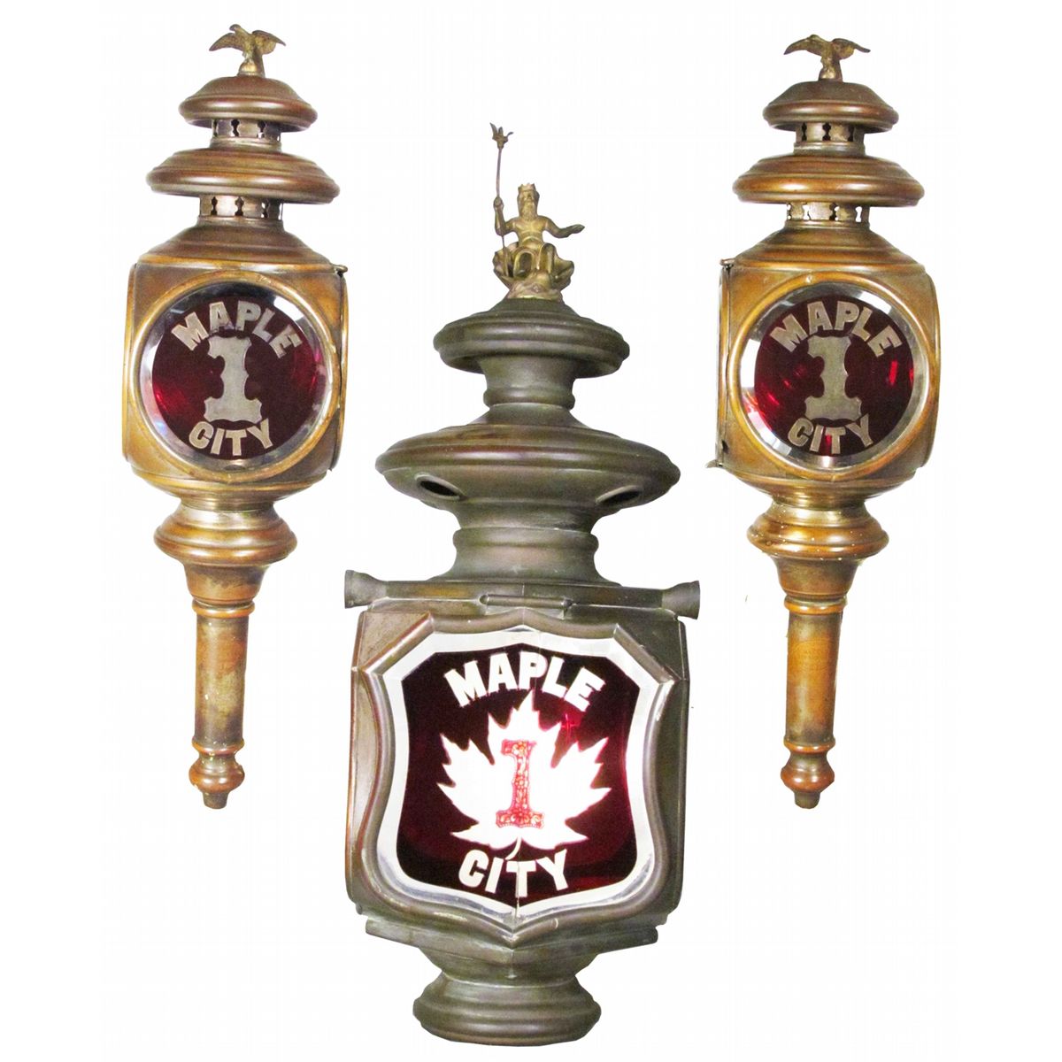 Maple City Fire Apparatus Lanterns Set of Three. Main lantern has etched ruby and cobalt glass with Neptune finial, vertical crack in front panel, 22 inches tall. Side lamps with brackets in excellent condition.