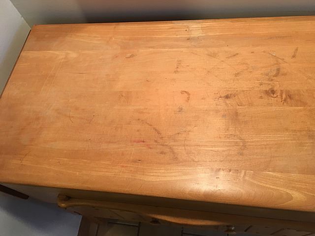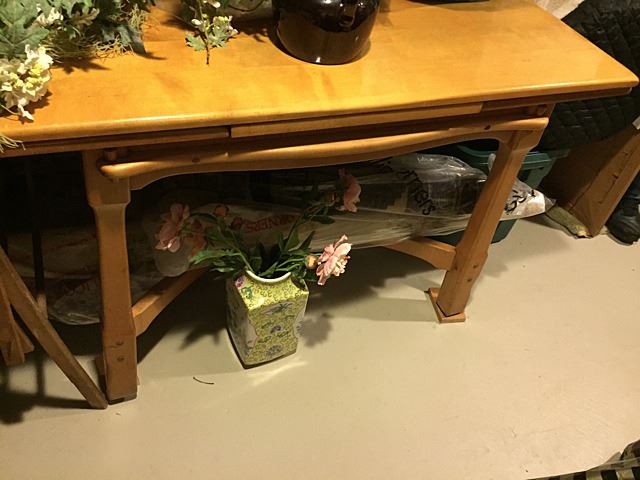 Maple kitchen set, Art Modern style, c. 1940's, table with extension leaves underneath, hutch, server, possibly with 4 chairs.