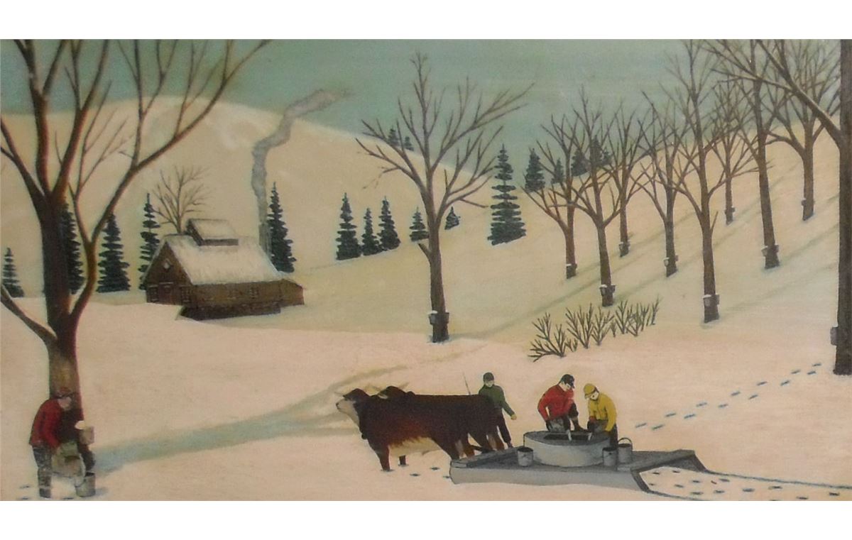 Gathering the old fashion way Maple Sap to make Maple Syrup or Sugar, an original unique antique painting by Joachin Burcheron Lariviere (deceased) with such naif folklore-style creation as an today's historical scene because such is not the way in 2015 with mechanical ways; the oil is 16 high x about 24 inches; wood original frame can be included if you like too.