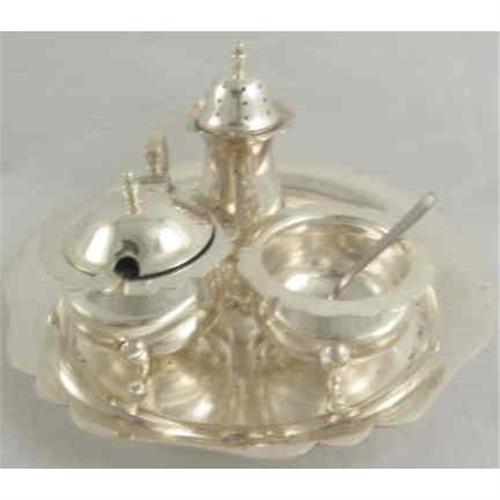 Each piece is marked as shown, even the mustard spoon. This is an english Salt cellar, Pepper shaker and Mustard pot on an integral tray.The cobalt blue glass liner is still intact in the mustard pot, the salt liner is missing as is the salt spoon. All Pieces made by Mappin and Webb and marked as follows:- Triple Deposit, Princes Plate, London & Sheffield W25983. a Charming little set. The tray is 5.1/2" across and has slight loss of plate in one place, each piece has three legs.