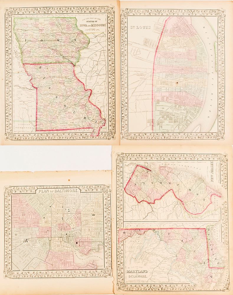 Single, multi color map of Maryland, Delaware and New Jersey. 12.5"x15.25"; single, multi color map of Plan of Baltimore. 12.5"x15.25". Date: 1867 Location: Baltimore, Maryland HWAC # 54228
