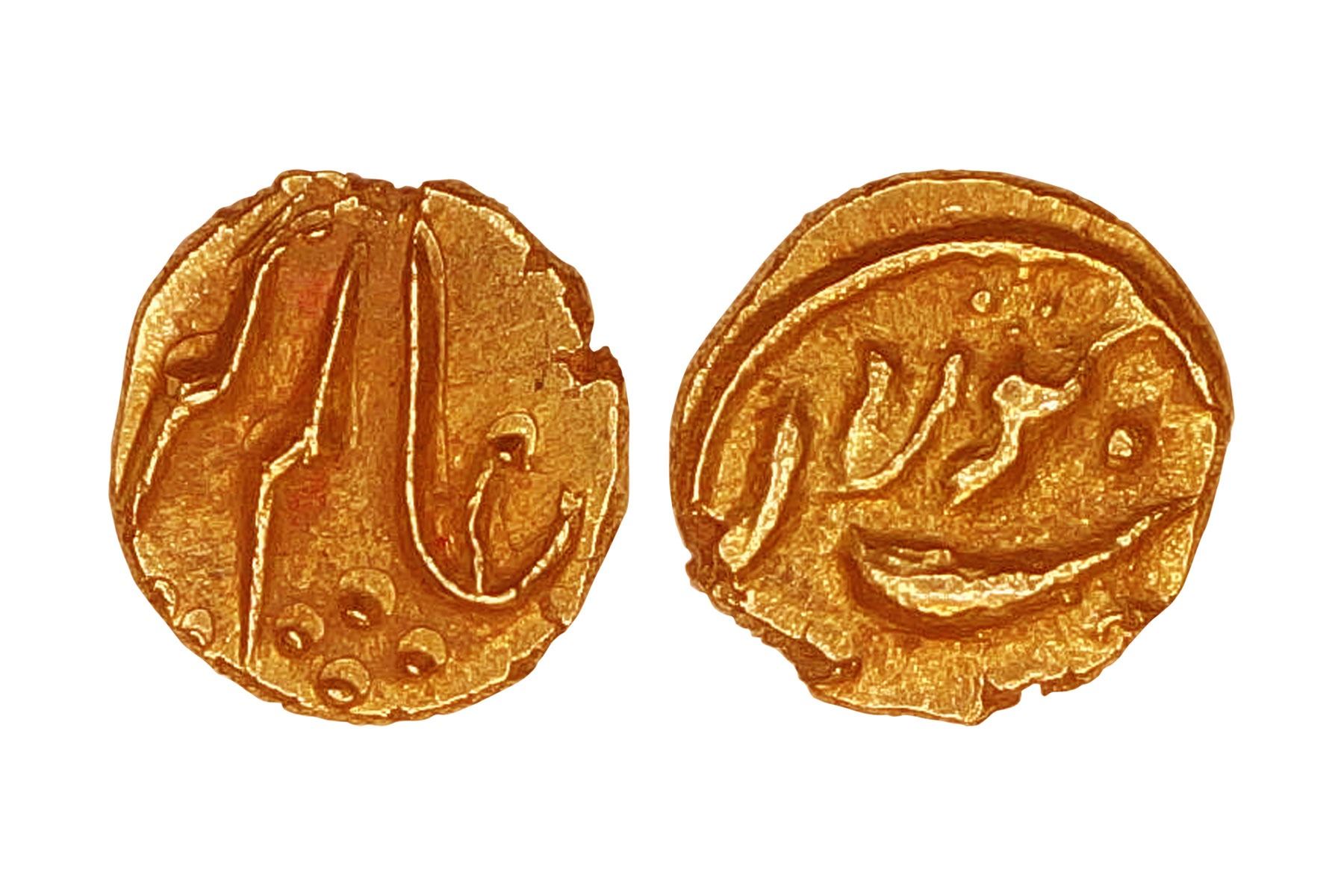 Maratha Confederacy, Gold fanam, Kolar mint, in the name of Alamgir II, Alamgir on obverse and mintname on reverse M&W T2, 0.35 grams. Very Fine+, Rare.