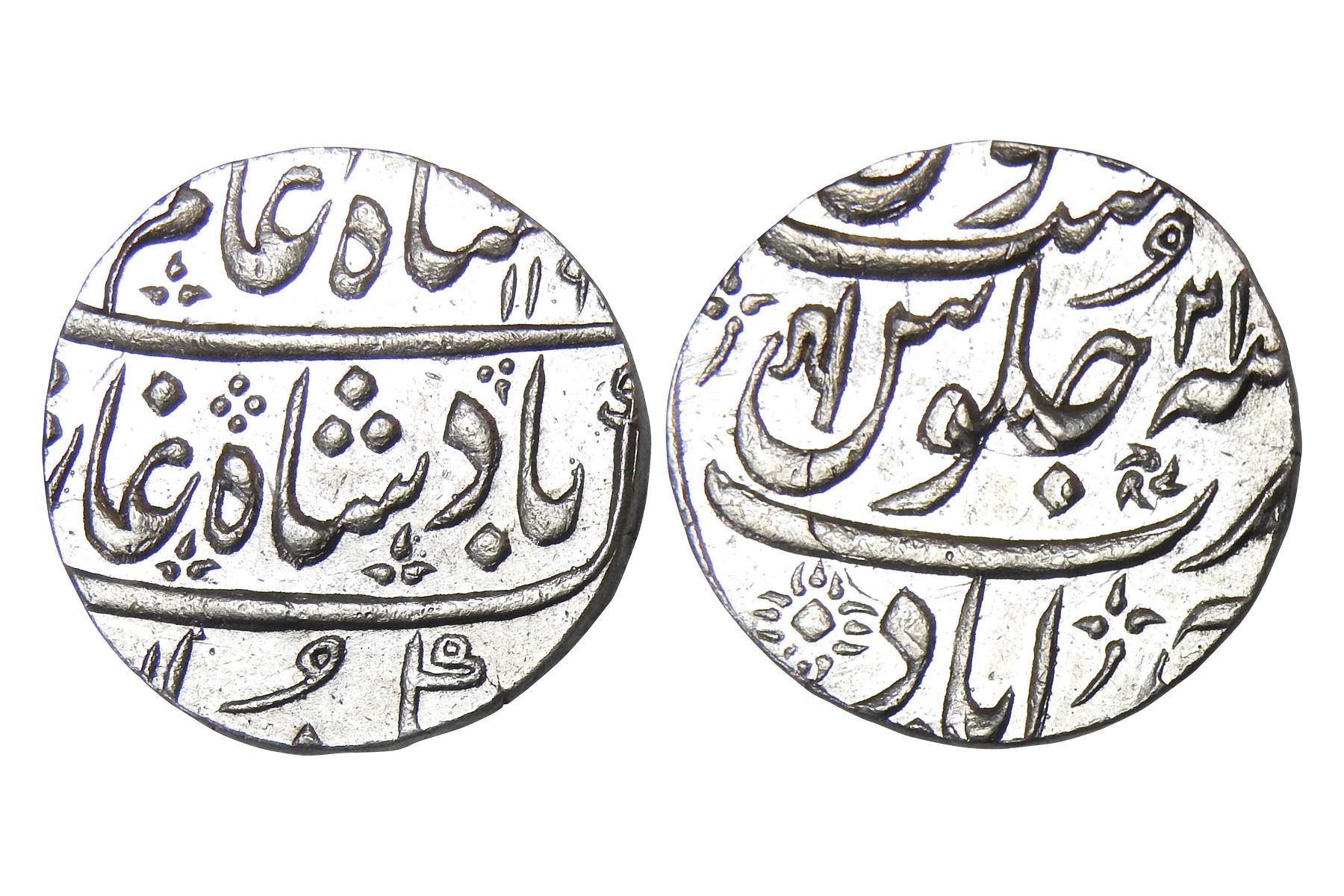 Maratha Confederacy, Silver rupee, in the name of Shah Alam II, AH119X/RY21, ‘Ankus’ mint-mark on reverse, M&W T4, 11.70 grams. Rupees like this were known as the Ahmadabad ‘Hali Sikka’ and were struck from the mint located in an area controlled by the Peshwas (the city of Ahmadabad was divided into two parts – the other being controlled by the Gaekwars). Extra Fine, Scarce.