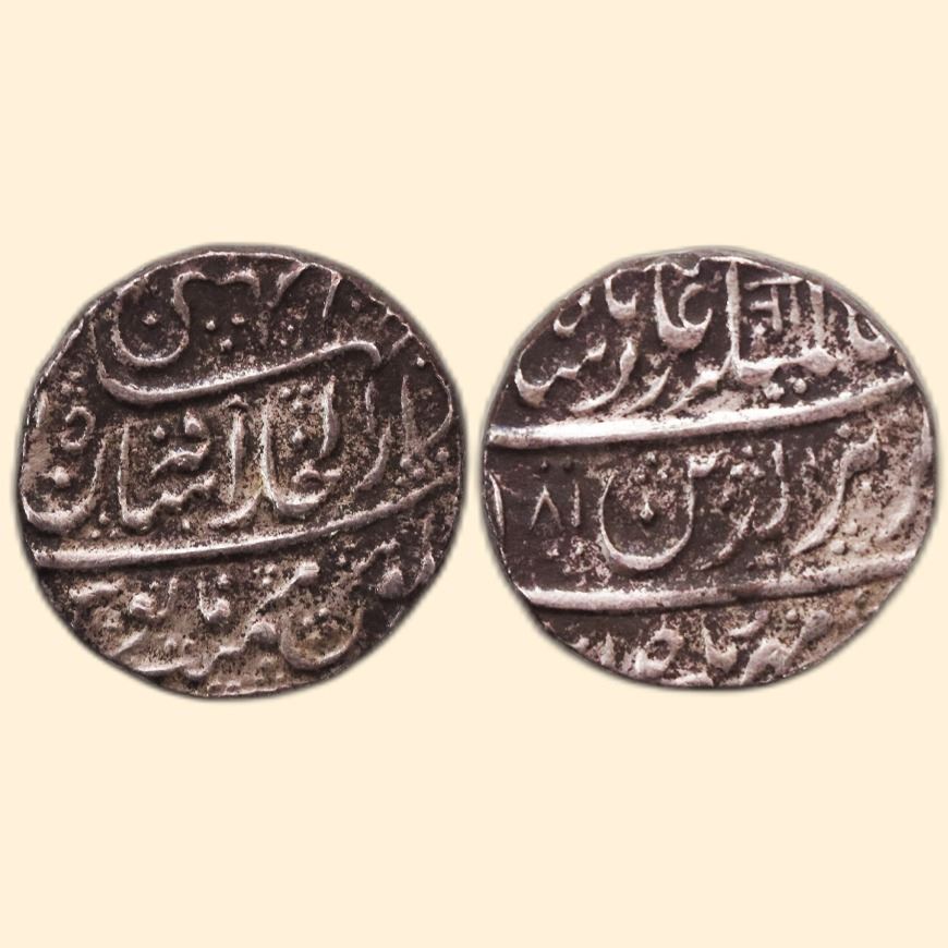 Independent Kingdom, Maratha Confederacy, Athni Mint, Silver Rupee, 11.20gms, Pseudo mint name Dar ul Khilafat Shahjahanabad, AH 1181, RY 10, in the name of Shah Alam II, Nagari letter ‘Ra’ on obv top right, complete mint name on rev top area. (KM # 255).