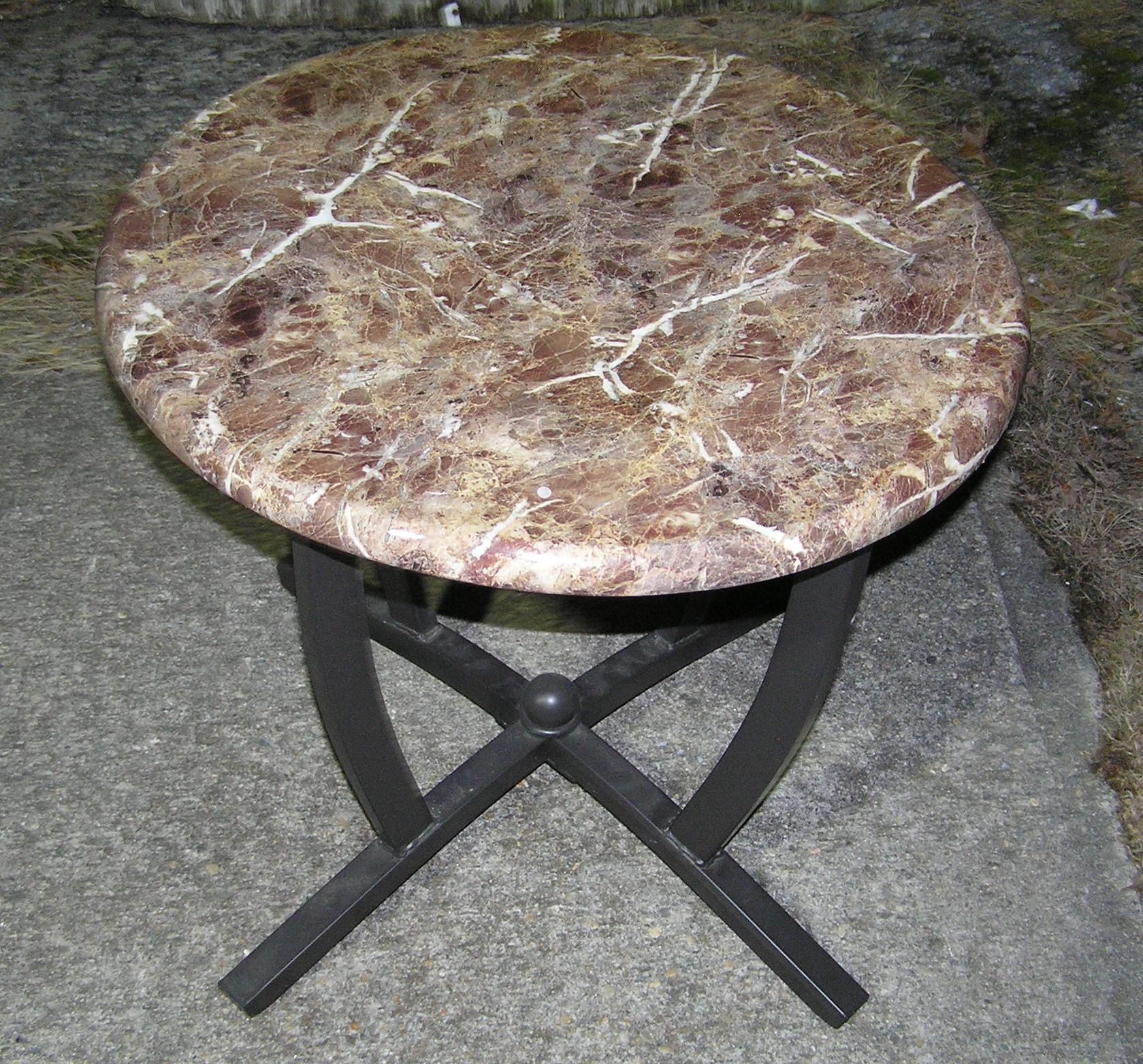 Marbelized end table 23 inches round all metal base by King Tree Hand Craft Inc. of California customer to arrange pickup or delivery of this item est. value $150.00-$200.00