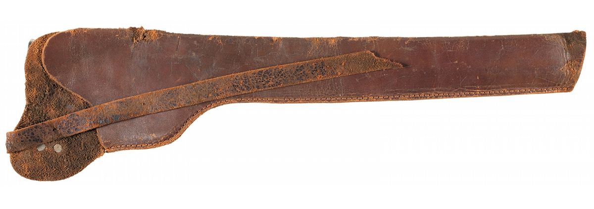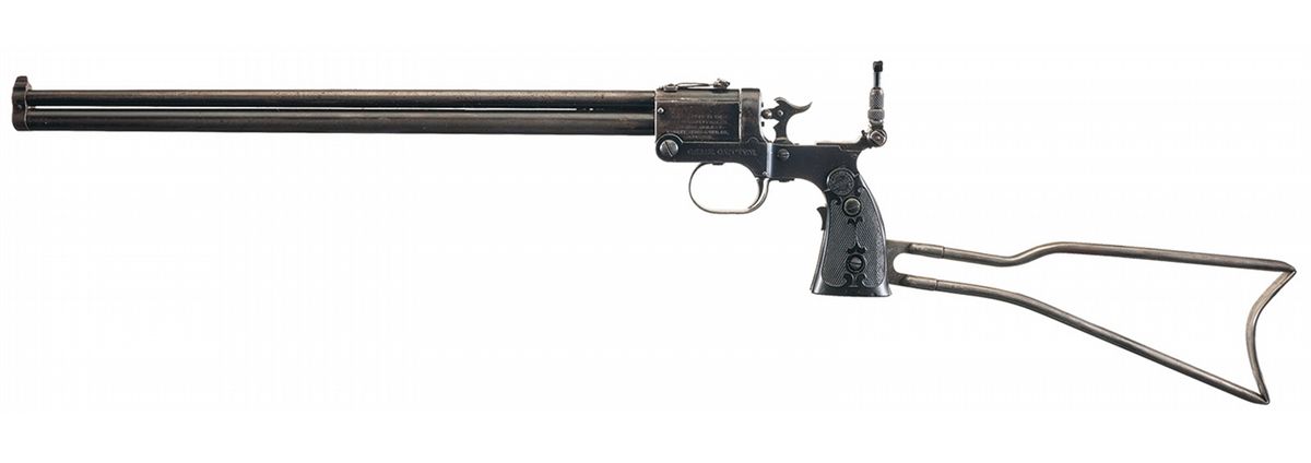 Manufactured between 1908 and 1918. Blade front sight, folding notch rear sight and a peep sight mounted on the frame behind the hammer. The caliber marking is on the upper right side of the chamber block "-MANUFACTURED BY THE-/MARBLE SAFETY AXE CO./-GLADSTONE, MICH.U.S.A.-/MARBLE ARMS & MFG.CO./SUCCESSOR" on the left side and "GAME GETTER" on the frame below. The right side of the frame is marked "PATENT/ALLOWED". Serrated hammer with mobile striker, checkered hard rubber grips with Marble markings, and a folding steel tube stock, which folds up under the gun for storage. Comes with an original unmarked leather holster.
