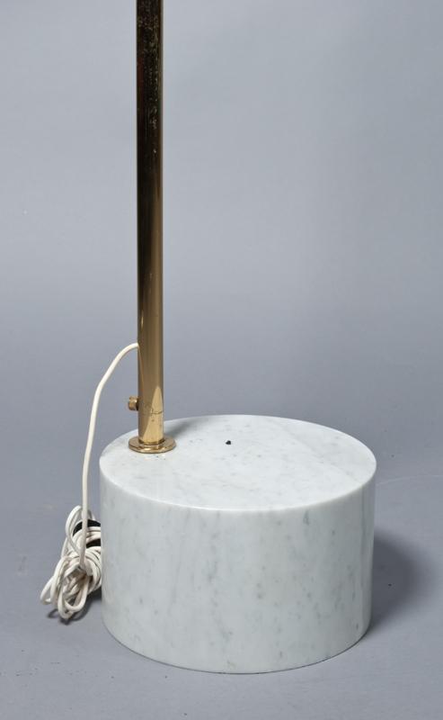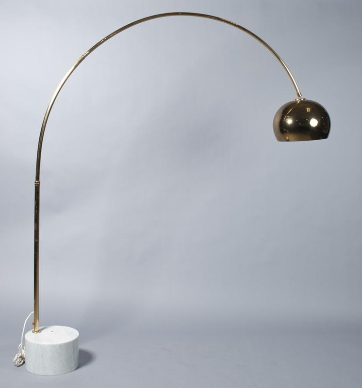 Arched lamp with ball form shade, attached to heavy marble base. 78" H x 67.75" L, with shade 51" from floor.