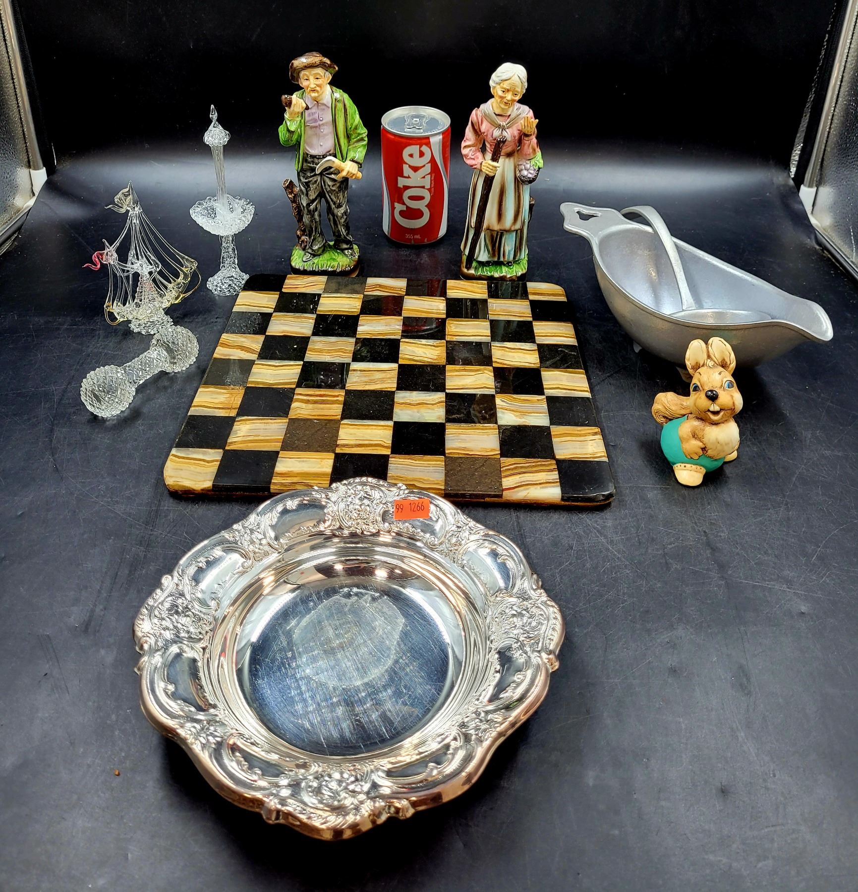 Marble Chess/Checker Board, Spun Glass Sailboat, Ceramic Figures, Gravy Boat, & More