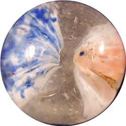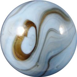 Striped Opaque. Two seams. Opaque light blue base. Covered with thin gray swirls. Some tiny pits. Cambridge OH, circa 1927-1929. 9/16". Near Mi...