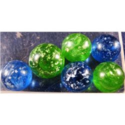 Lot of six marbles. Three blue Micas, three green Micas. 9/16" to 21/32". Mint (5 marbles), Near Mint (1 marble).