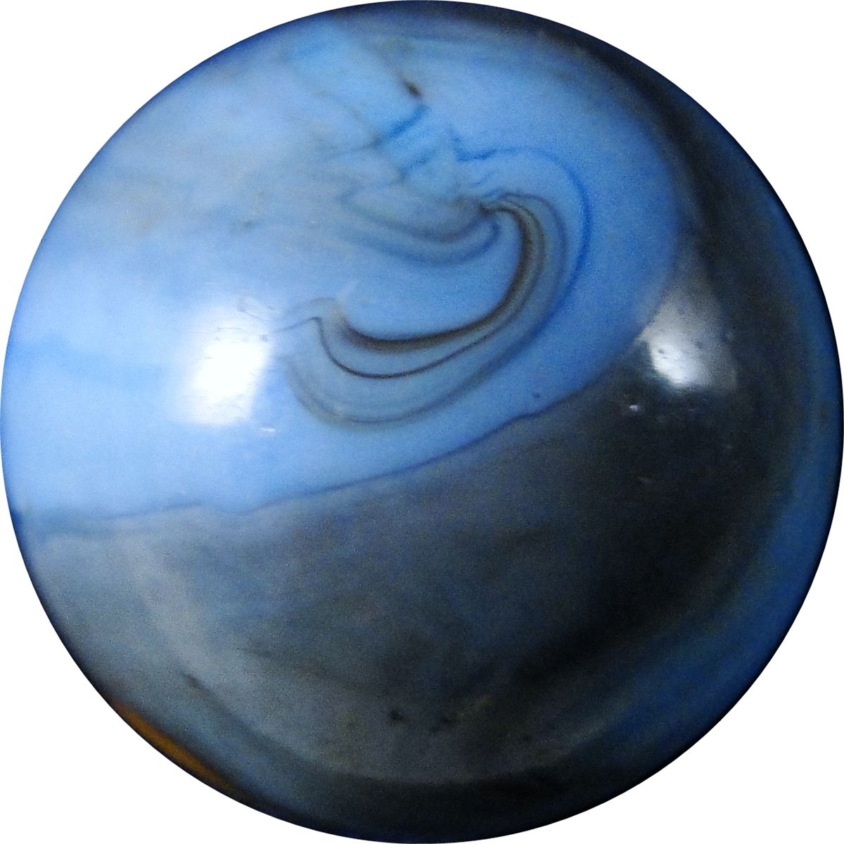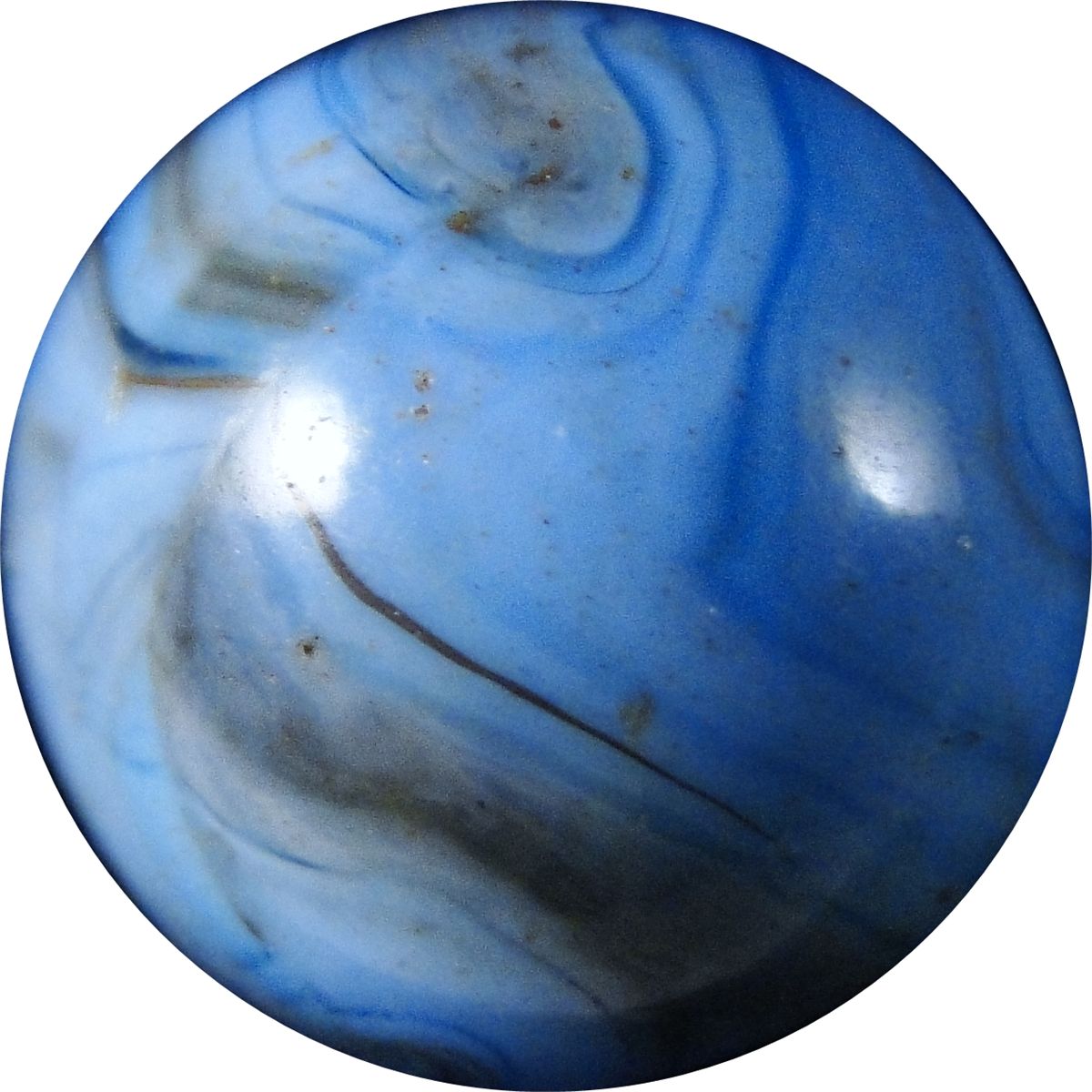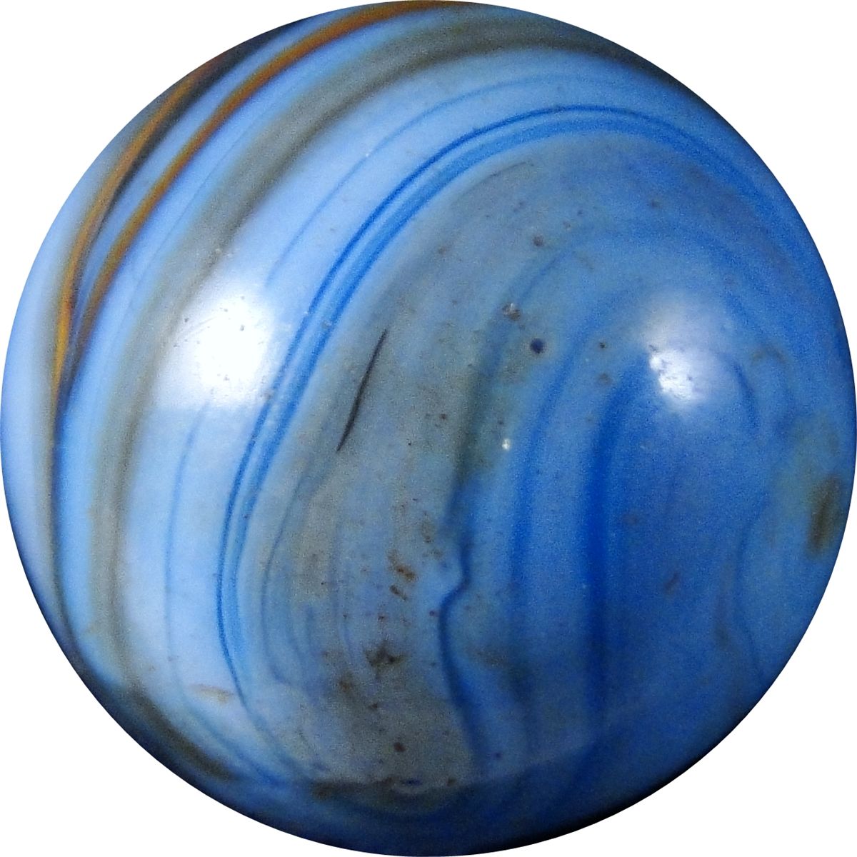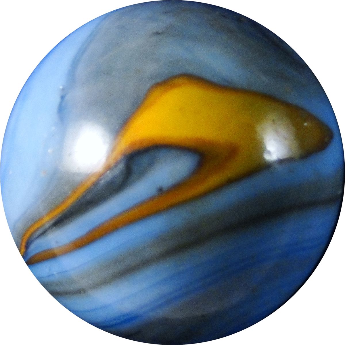 CHRISTENSEN AGATE COMPANY, Striped Opaque. Very pretty. Two-seam. Electric orange and gray on light blue. In very nice condition. Cambridge OH, circa 1927-1929. 19/32". Mint (9.7).