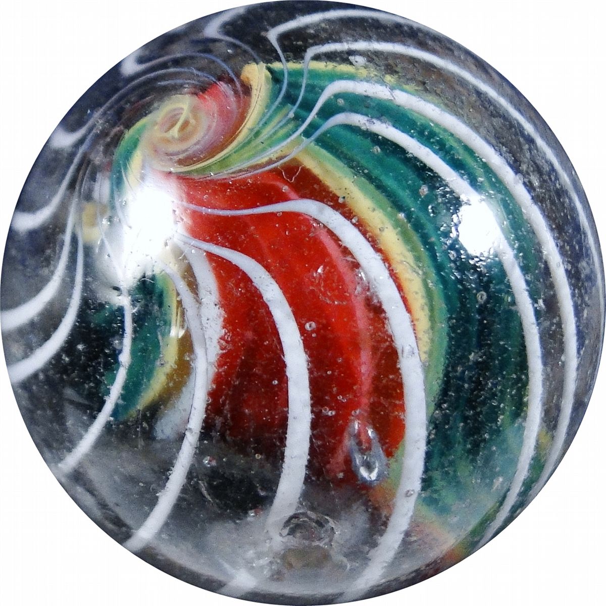 SWIRL, Divided Core. Very pretty Divided Core Swirl. Outer layer is a cage of white strands. Small subsurface moon and very small subsurface moon on one side. Tiny flake and tiny pit on the other. Germany, circa 1870-1920. 1-3/16". Near Mint (8.3).