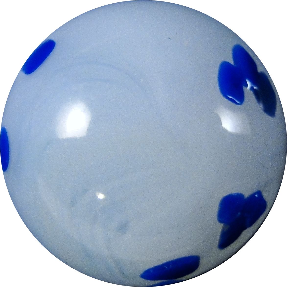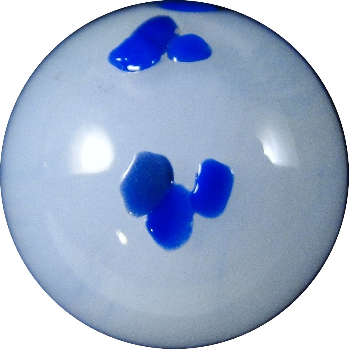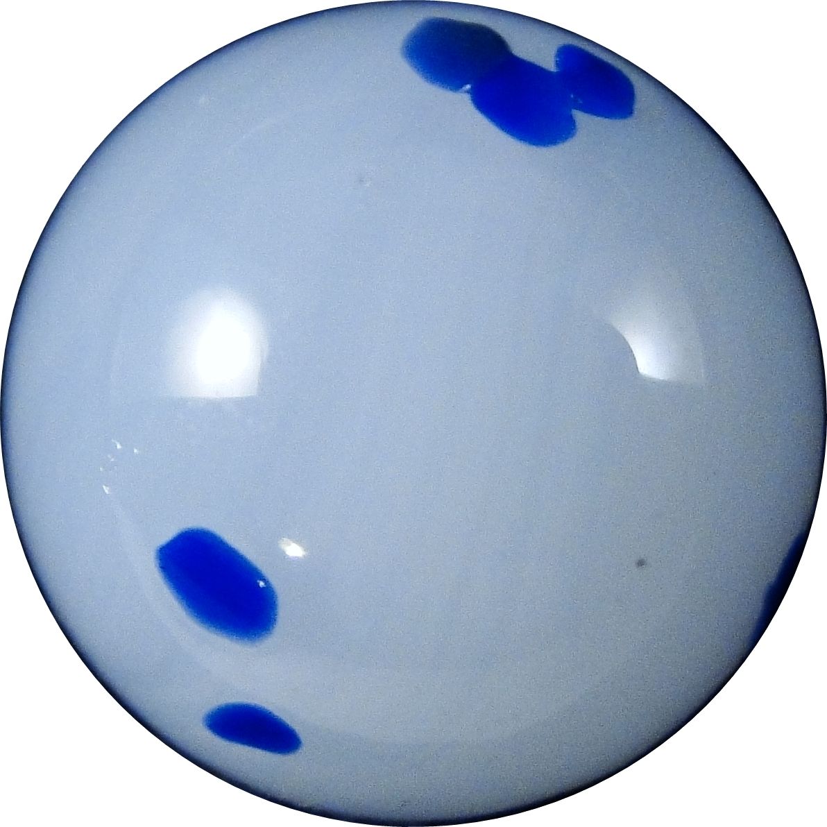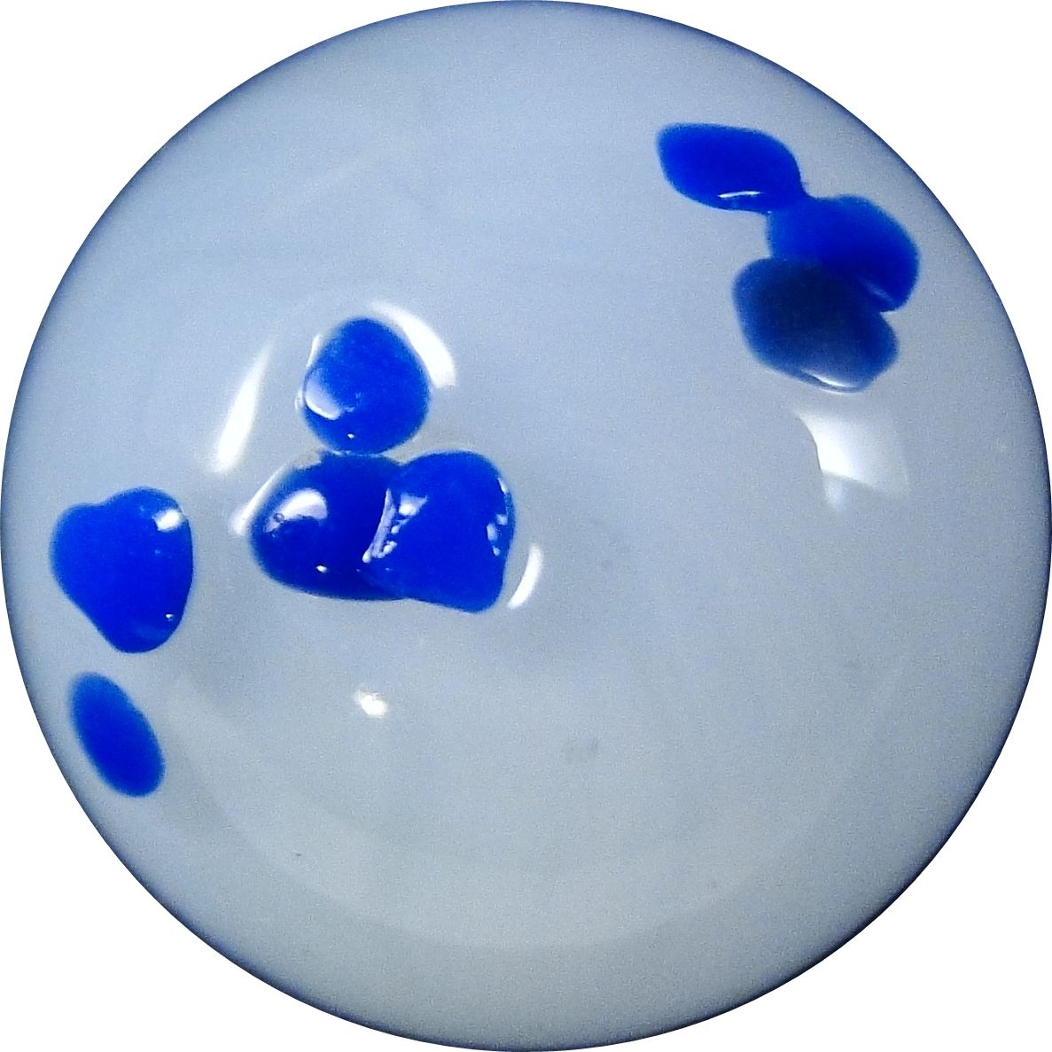 VITRO AGATE COMPANY, Confetti. This is one of the experimental Confetti marbles produced in Anacortes in 2000. Semi-opaque white opalescent moonie base with a couple of flecks of bright blue. This was a very short run. These were included in the inventory sold to Raelyn Dolton when the Anacortes plant closed. Twenty-five (25) of them were bought by Pete Caparelli of Land of Marbles, and this is one of the 25. Accompanied by a Certificate of Authentication signed by both Raelyn and Pete, providing the full chain of custody on this marble. Anacortes WV, circa 2000. 17/32". Mint (9.9).