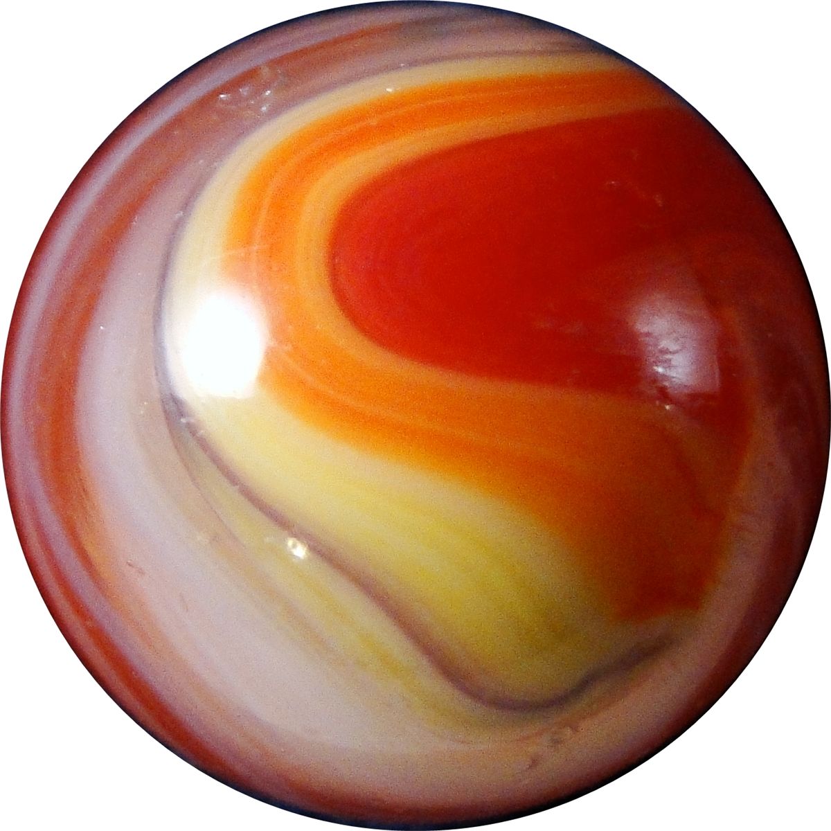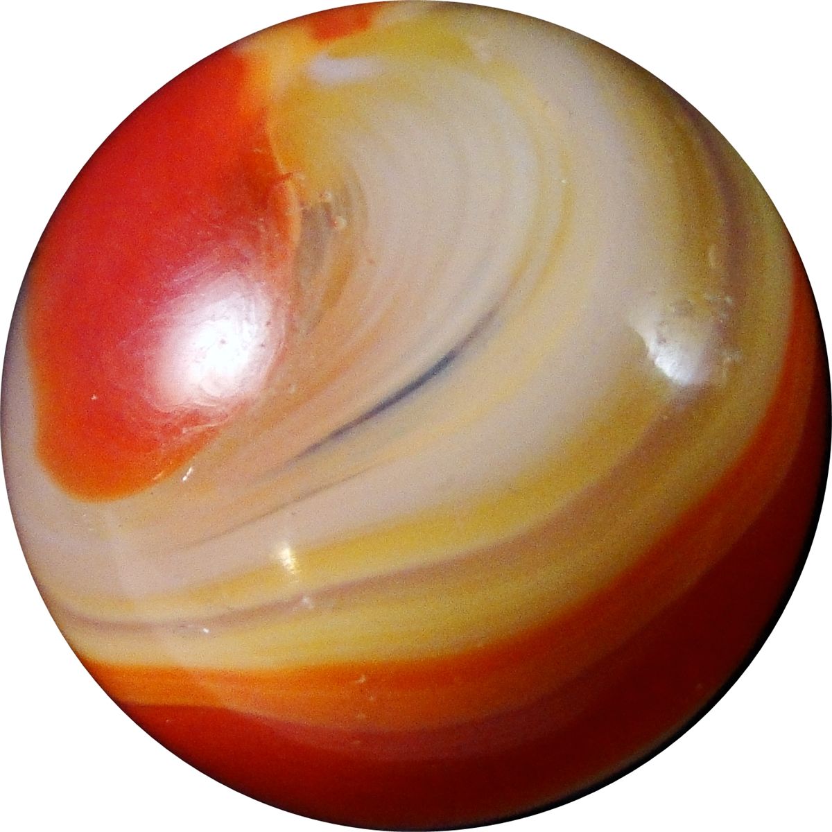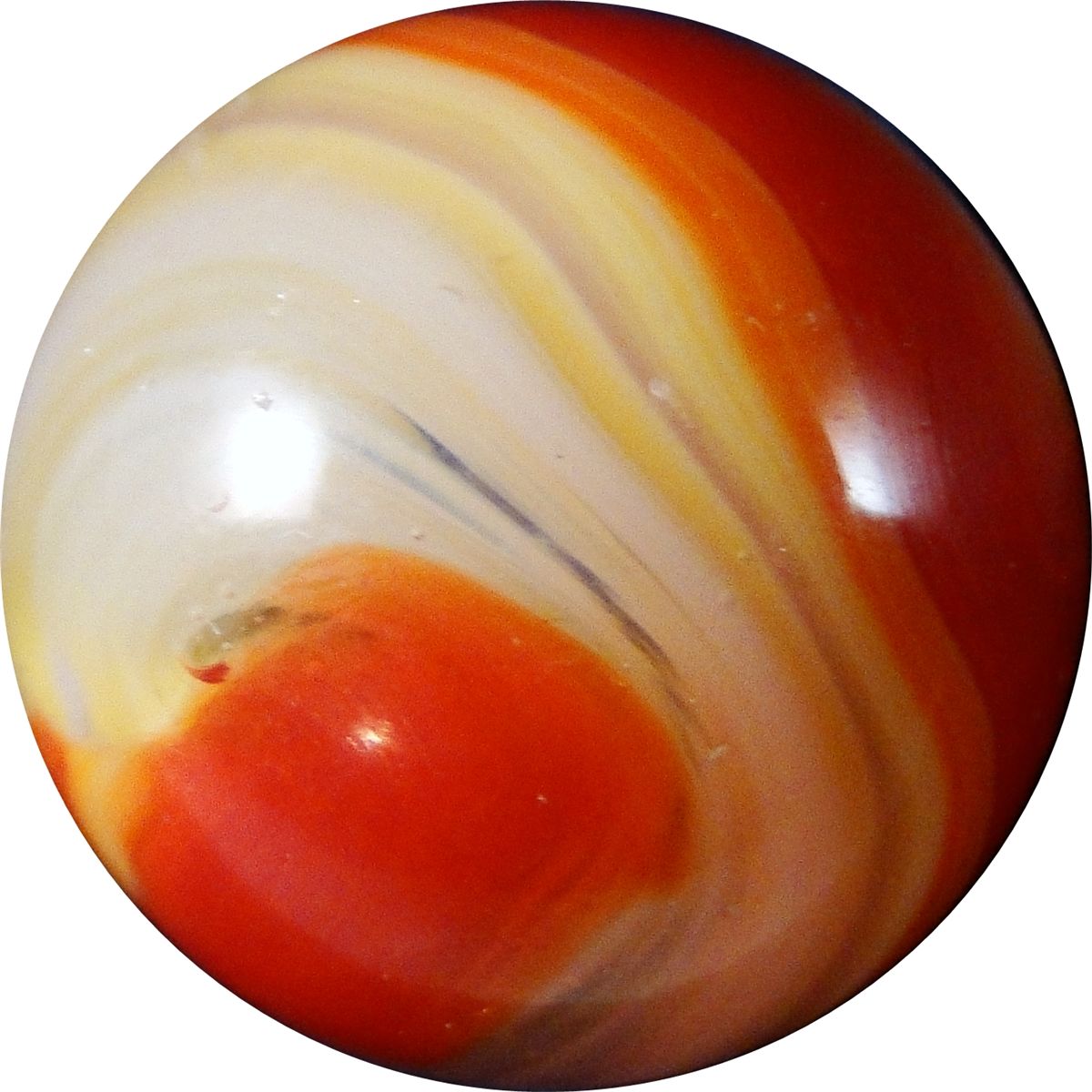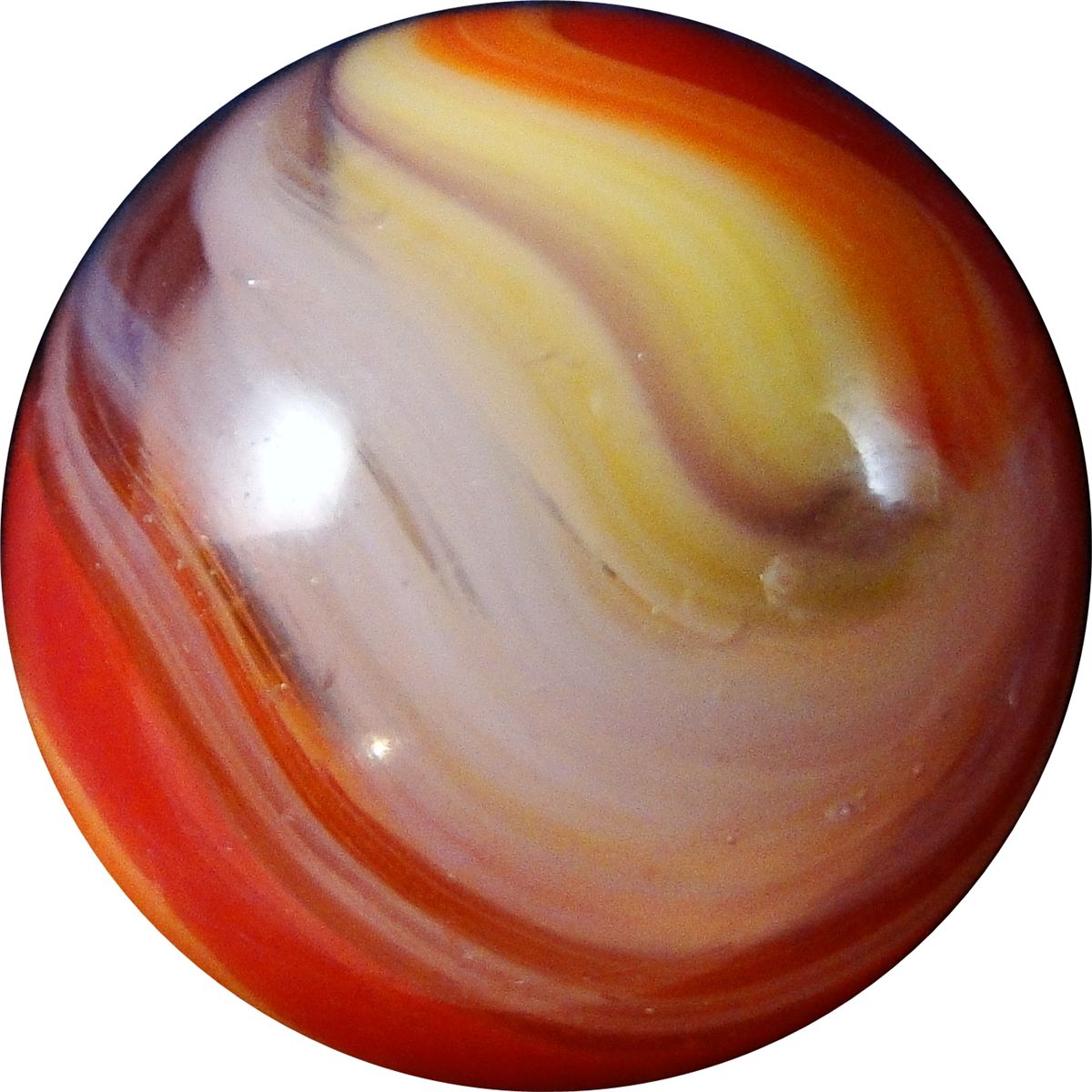 AKRO AGATE COMPANY, Popeye Corkscrew. Red and Yellow Popeye. Three tiny subsurface moons, some wear. Clarksburg WV, circa 1927-1935. 5/8". Near Mint (8.5).
