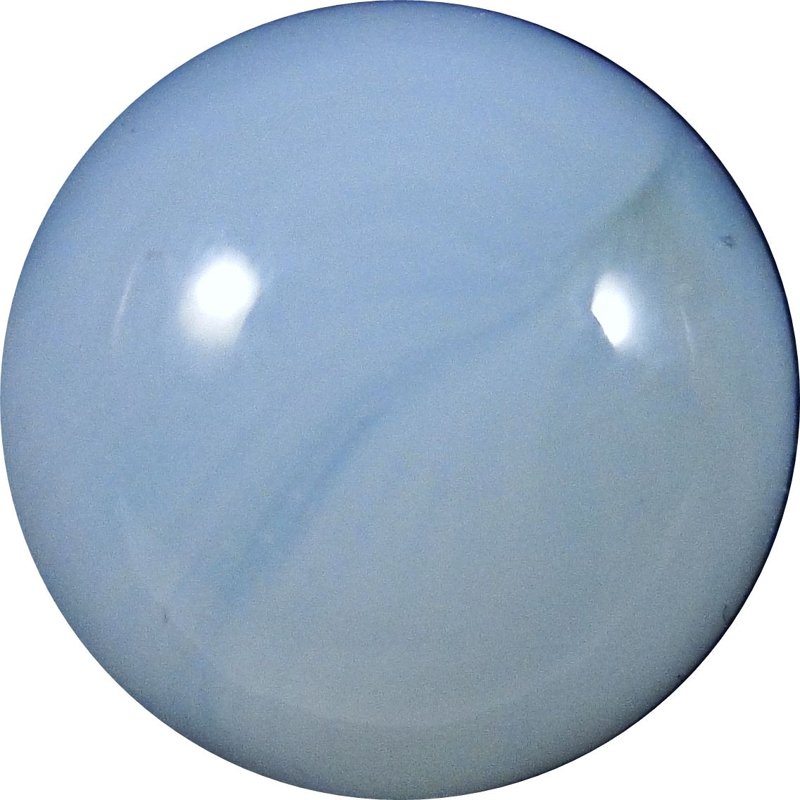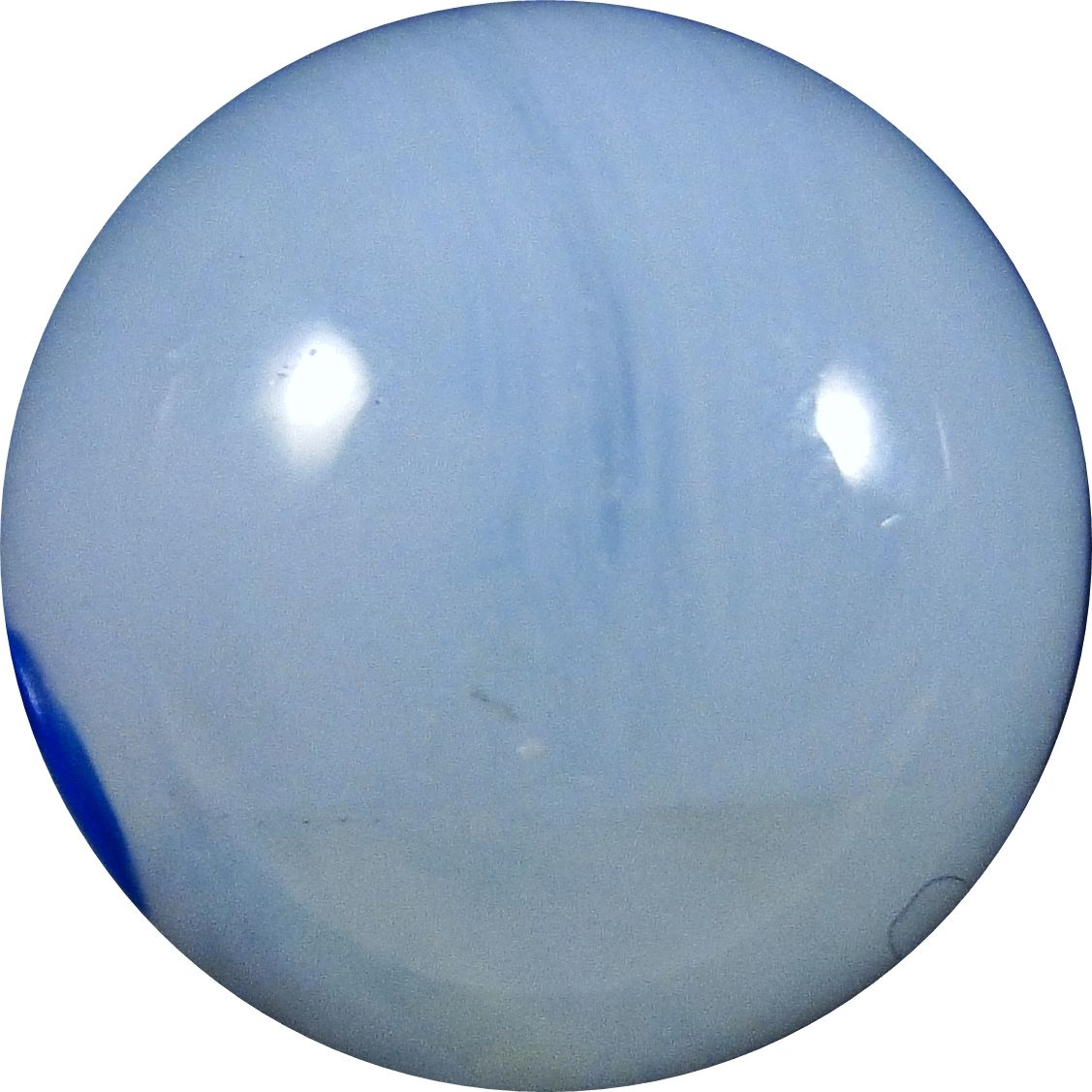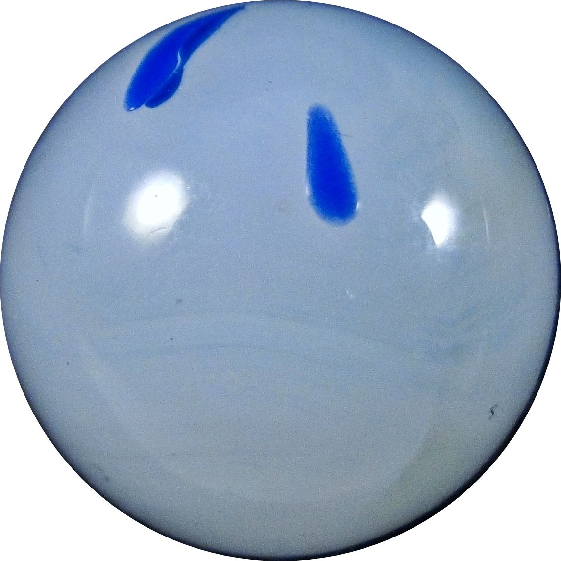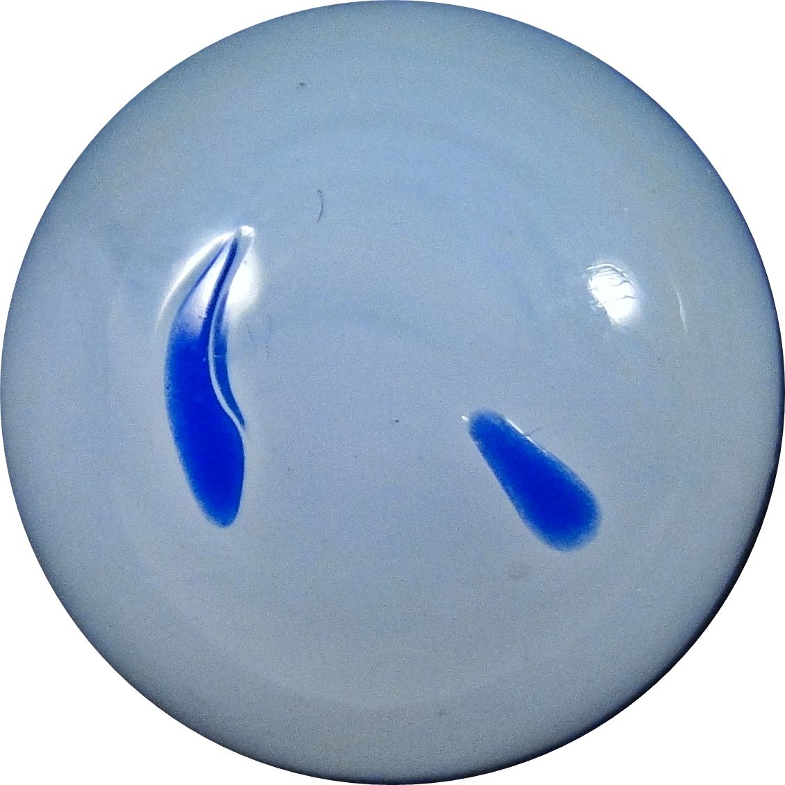 VITRO AGATE COMPANY, Confetti. This is one of the experimental Confetti marbles produced in Anacortes in 2000. Semi-opaque white opalescent moonie base with a couple of flecks of bright blue. This was a very short run. These were included in the inventory sold to Raelyn Dolton when the Anacortes plant closed. Twenty-five (25) of them were bought by Pete Caparelli of Land of Marbles, and this is one of the 25. Accompanied by a Certificate of Authentication signed by both Raelyn and Pete, providing the full chain of custody on this marble. Anacortes WV, circa 2000. 17/32". Mint (9.9).
