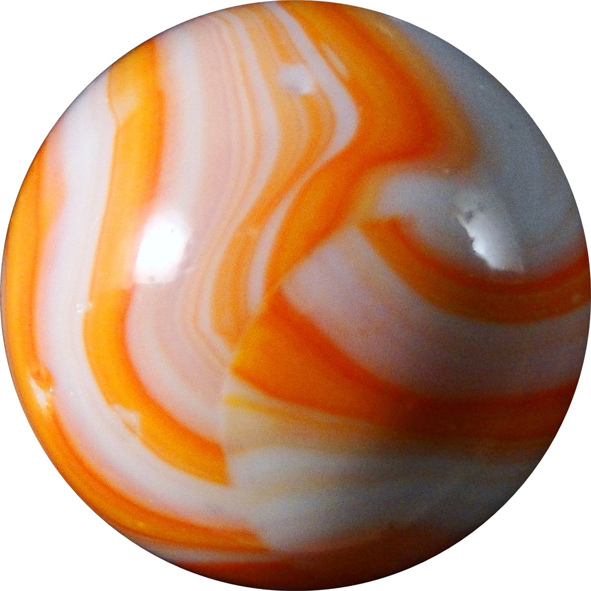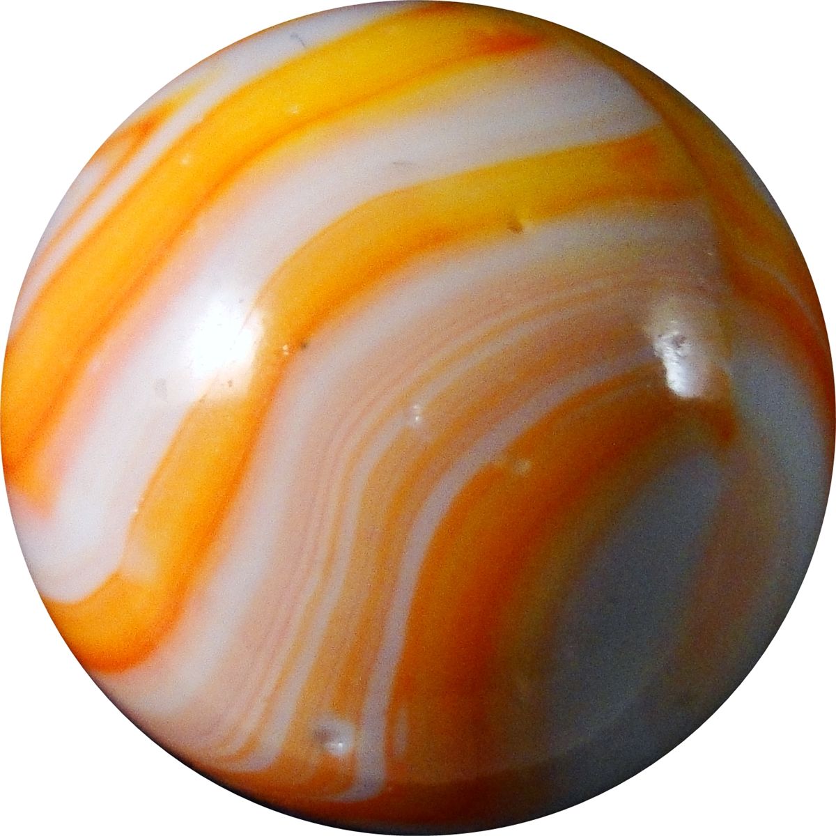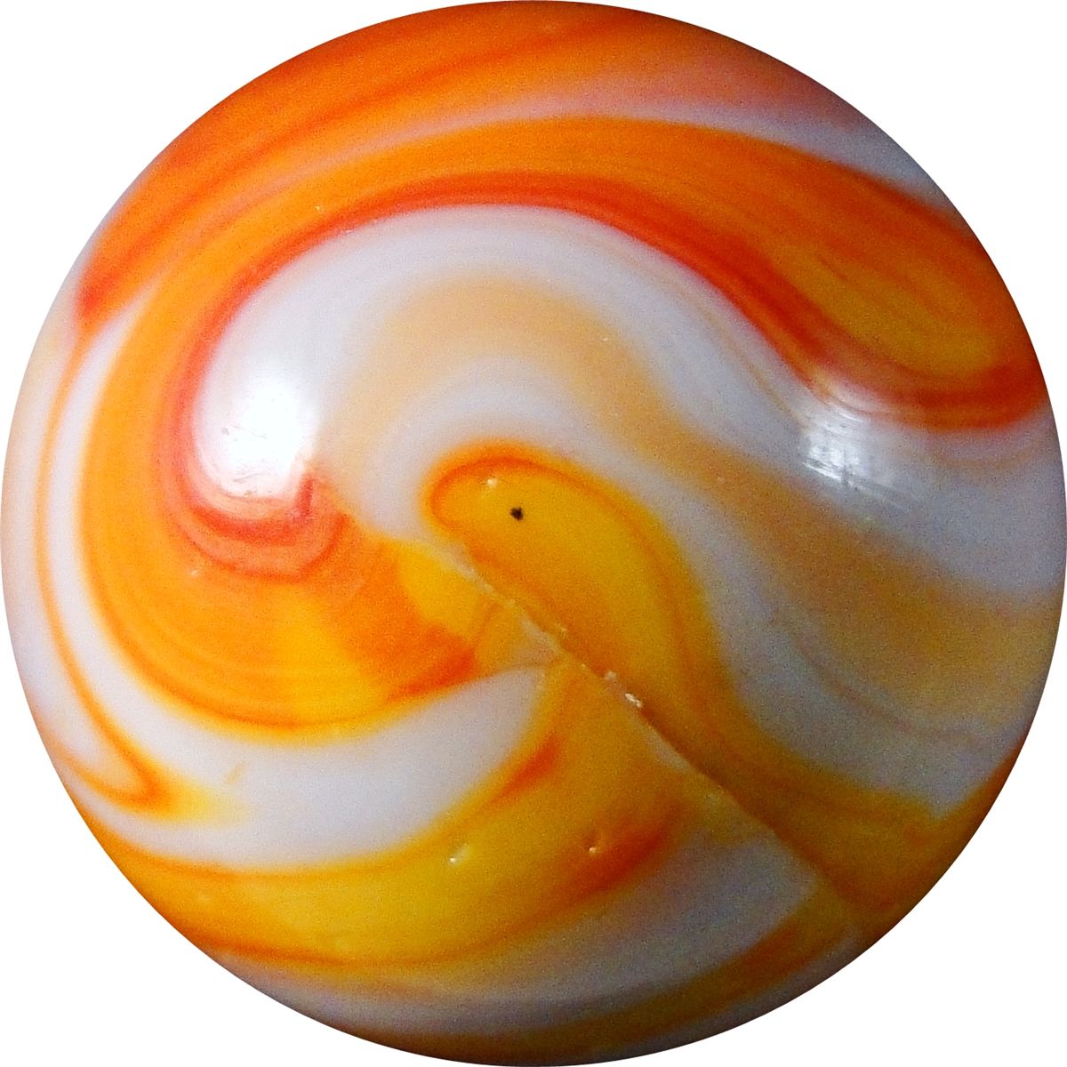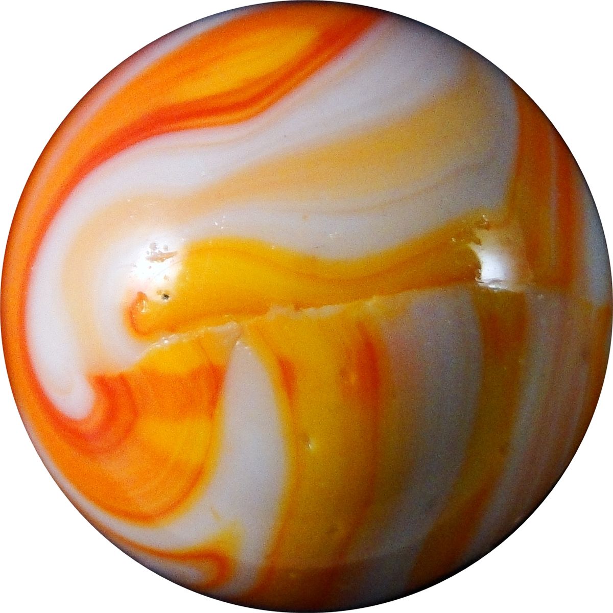 CHRISTENSEN AGATE COMPANY, Striped Opaque. Very pretty. Two-seam. Mixed yellow and red swirled on white. Several very tiny chips and pinpricks. Cambridge OH, circa 1927-1929. 5/8". Near Mint(+) (8.8).