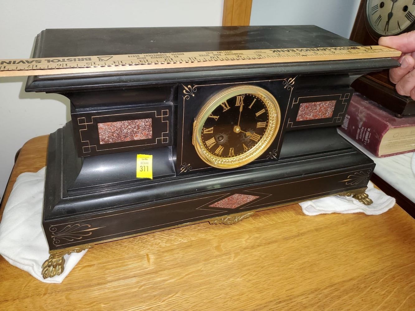 Marble shelf clock with pink marble inlay and incising, brass feet, very nice condition.