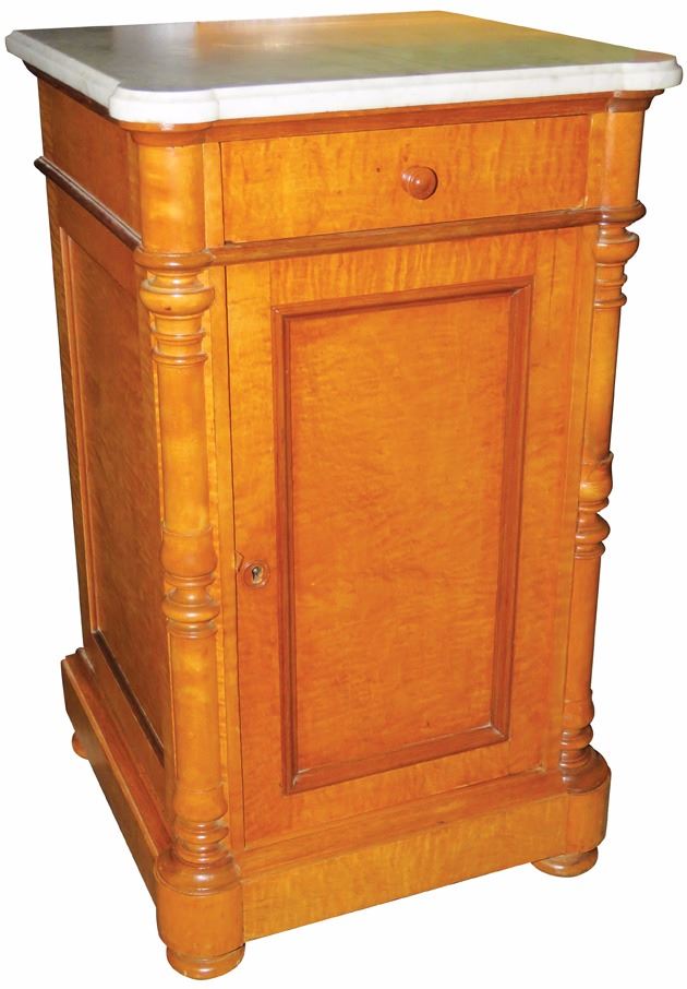 Burlwood Marble Top Nightstand. Suitable for Candy Store Cash Register Display. Excellent condition. 17 X 28 X 16 inches.