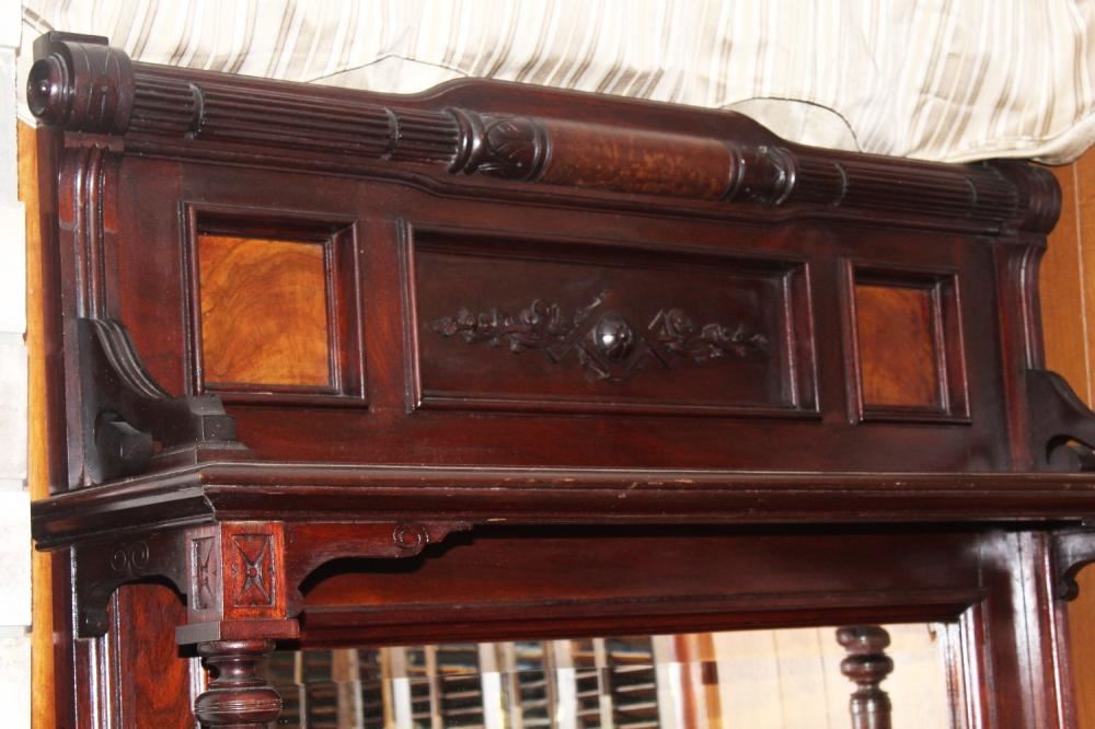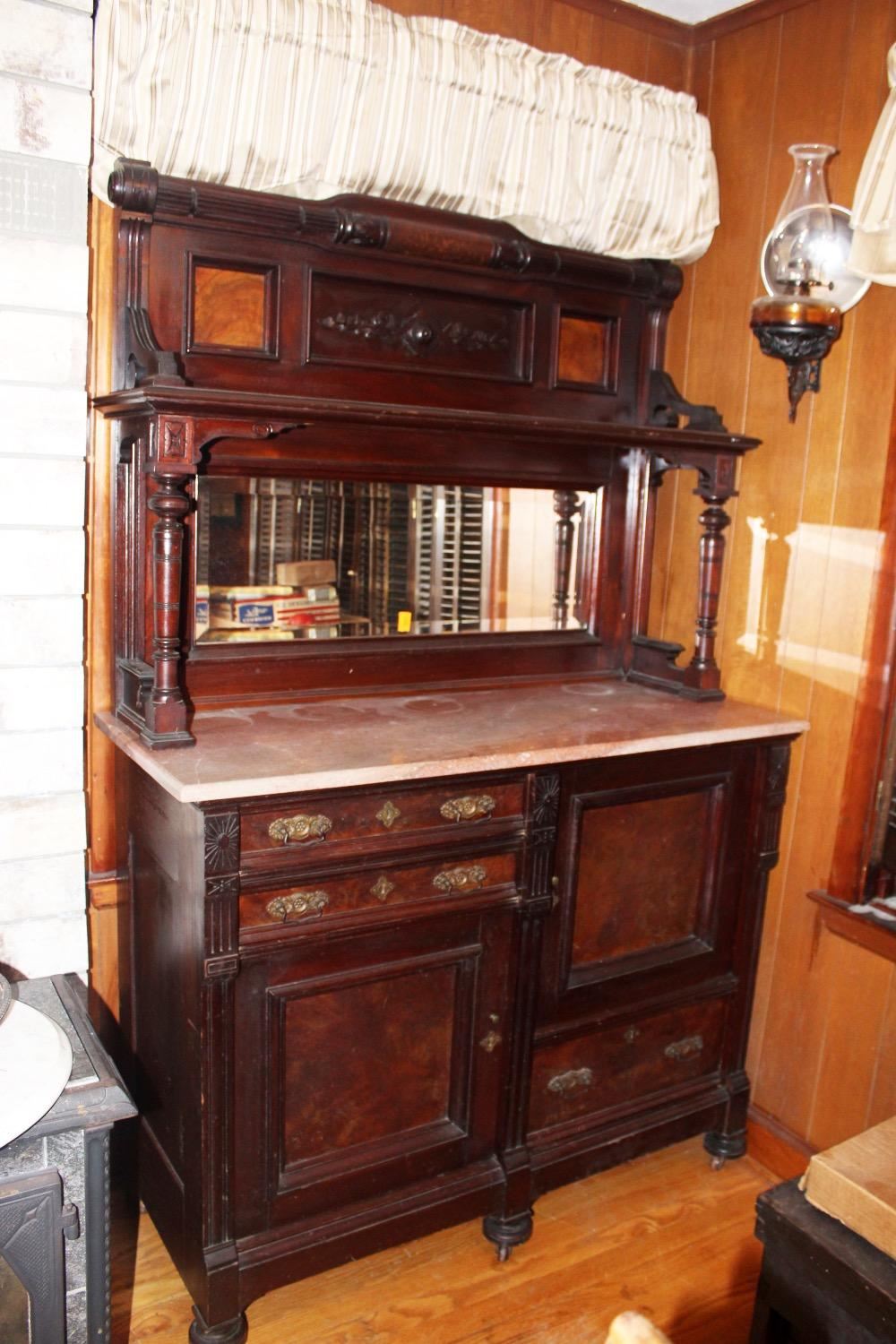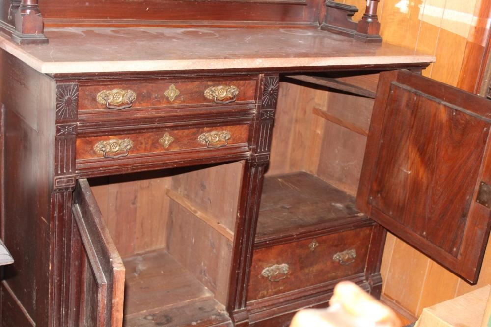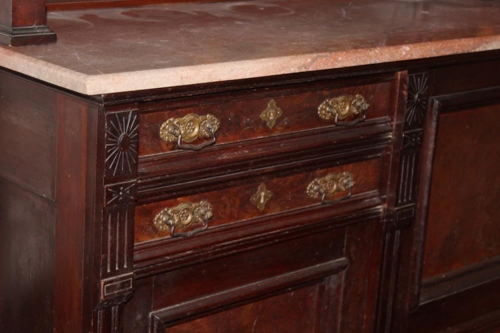 Marble top sideboard, top shelf and crest with carved flowers and scroll, burling throughout, brass hardware, rougue marble top, 3 drawers with 2 doors. Beautiful sideboard! Measures approx. 4 ft wide x 19 inches deep x 5 ft tall