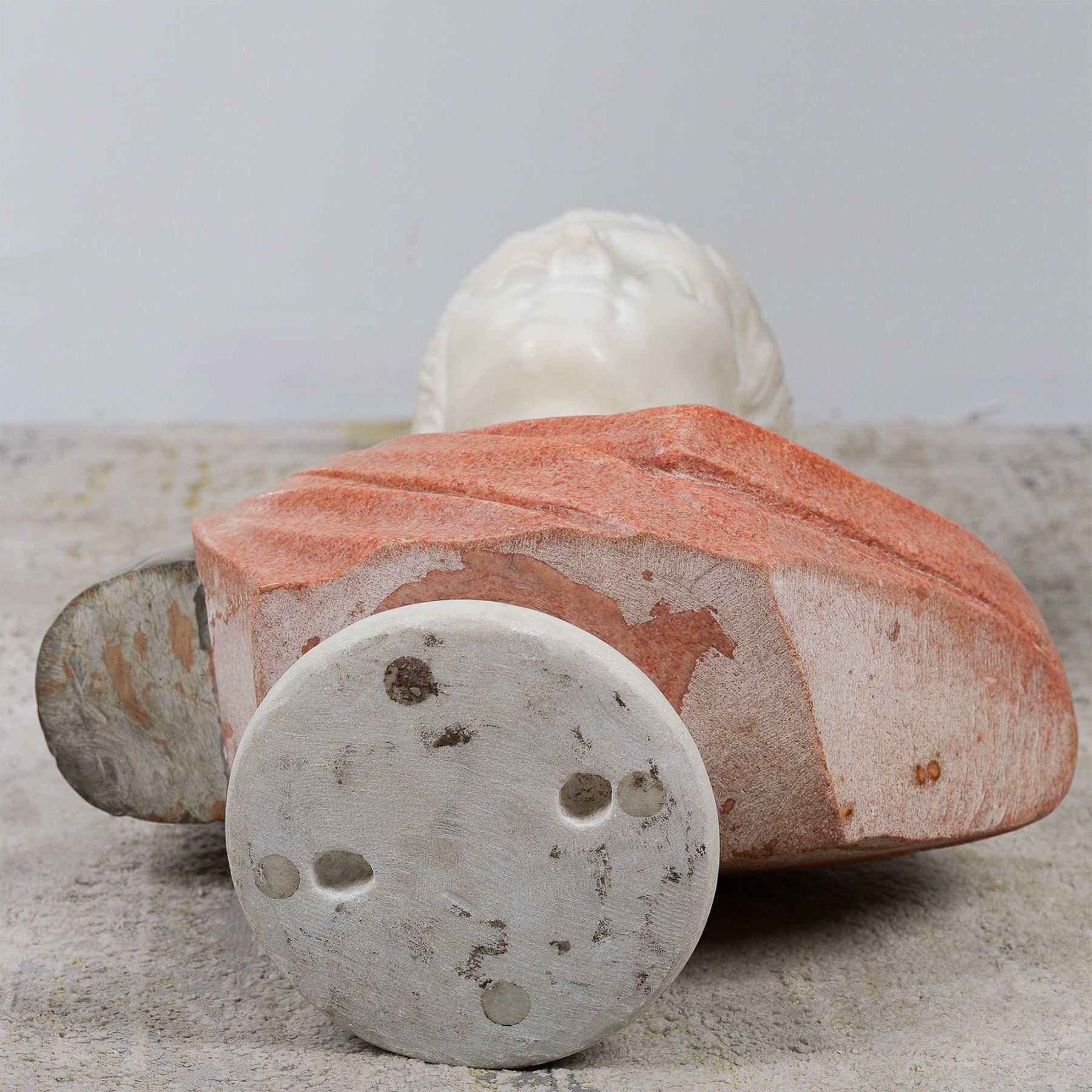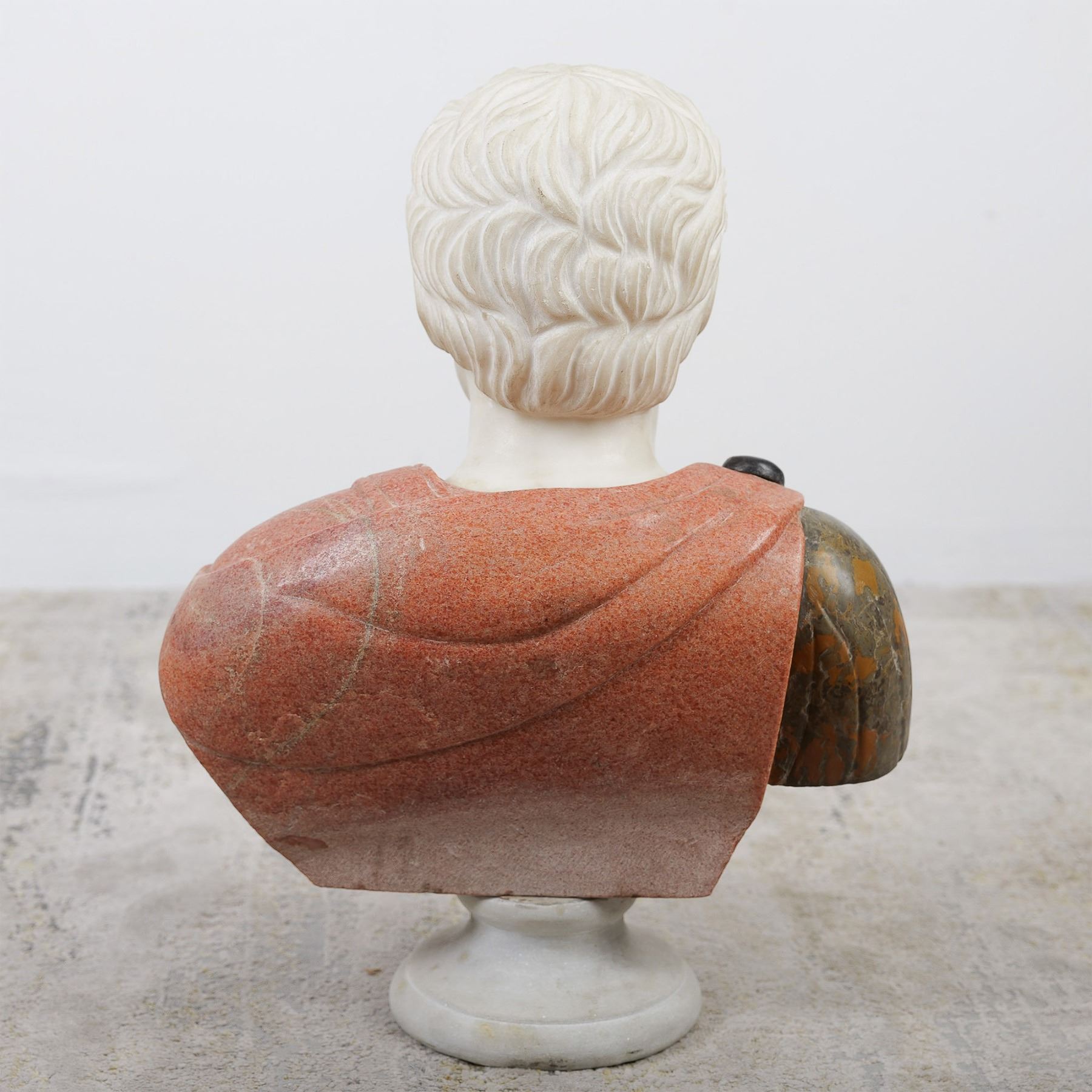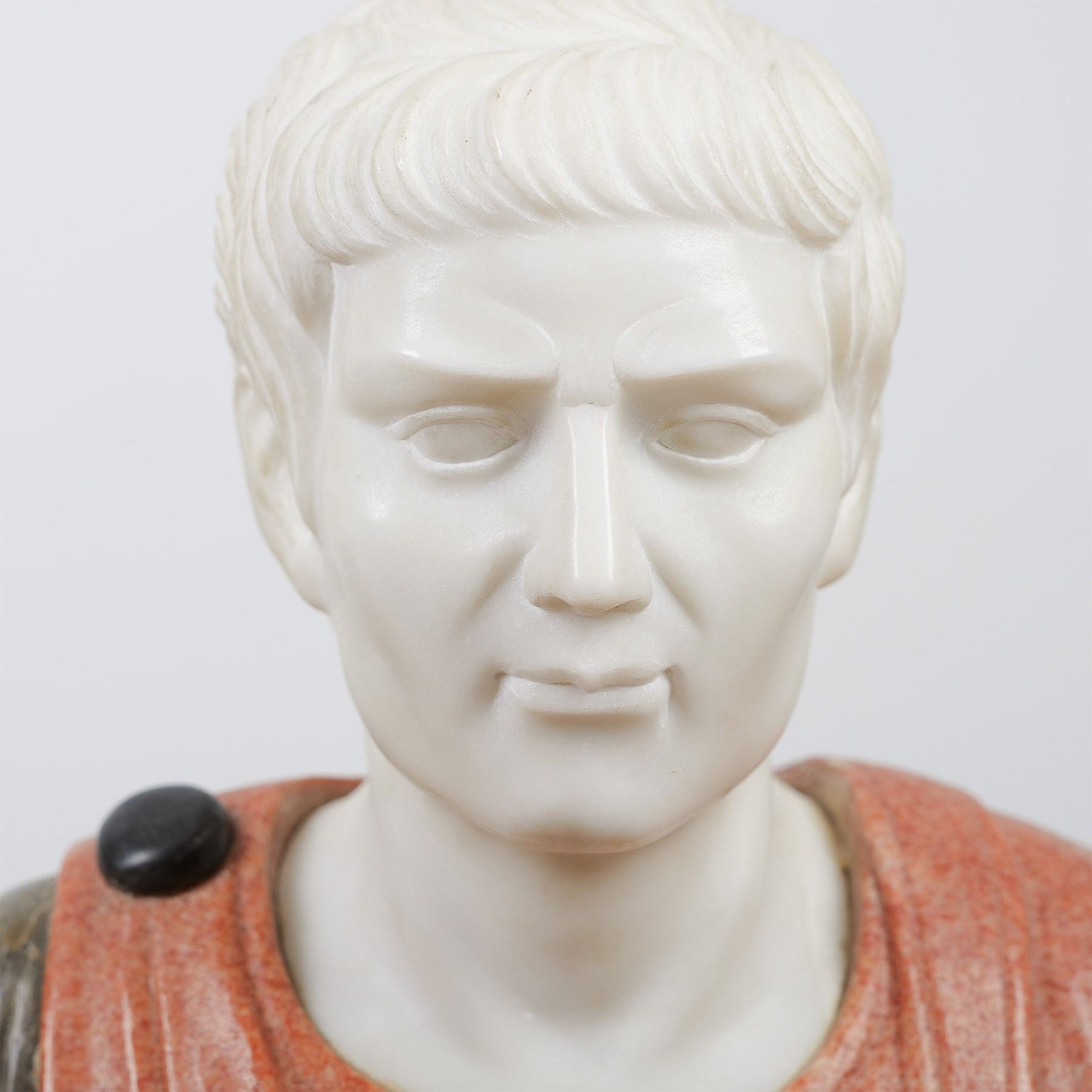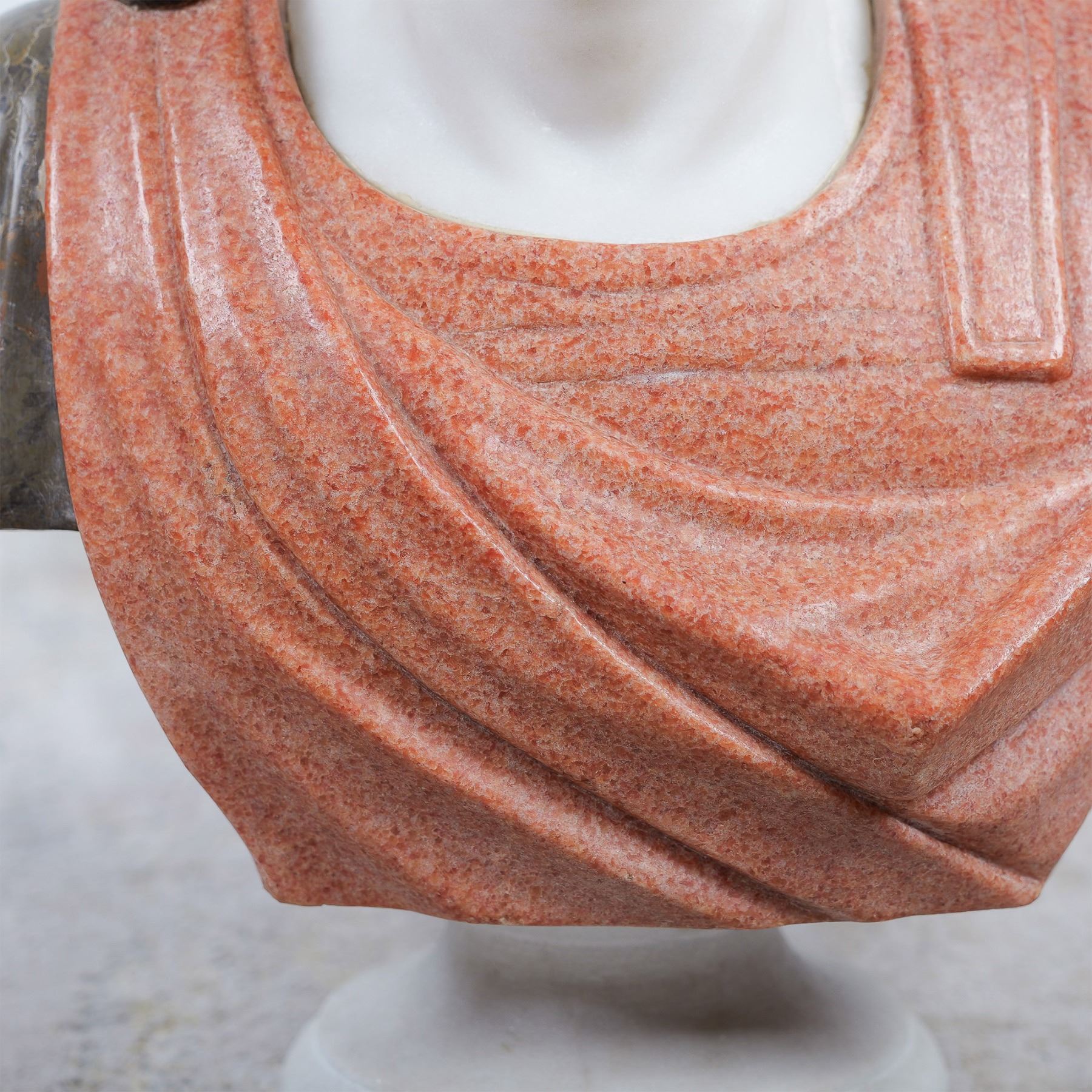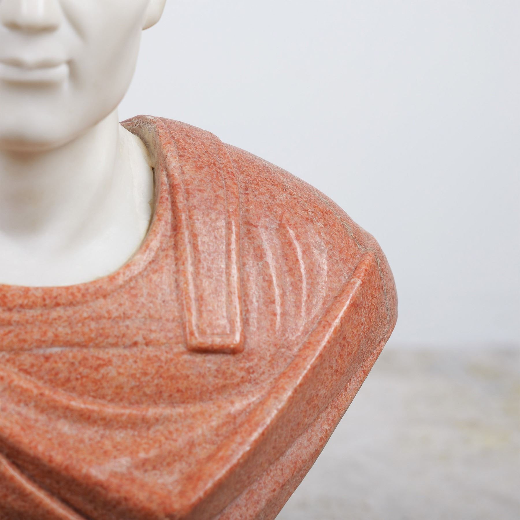 A finely crafted marble and alabaster bust depicting Emperor Augustus, the first Emperor of Rome (27 BCE-14 CE). This neoclassical interpretation of Augustus is sculpted with remarkable detail, featuring a serene yet authoritative expression, stylized short hair, and a toga draped over his shoulders. The bust is composed of multiple types of stone, with the head rendered in white marble, the drapery in a reddish alabaster, and additional decorative elements in dark stone, adding to its visual depth and realism. This piece is inspired by ancient Roman portraiture, which emphasized Augustus' idealized yet approachable features, reinforcing his image as a benevolent and powerful ruler. Such busts were common in public and private spaces of the Roman Empire, symbolizing the authority and divinity of the emperor. A highly decorative and historically significant sculpture, this bust is an excellent addition to any collection of classical art, historical artifacts, or fine decor. Dimensions with rotating marble base: 18"L x 11"W x 24"H.