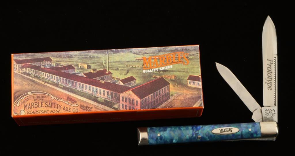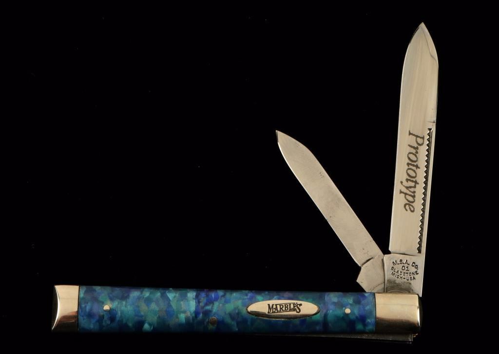 Blue flecked synthetic handle 'Prototype' etched on blade.