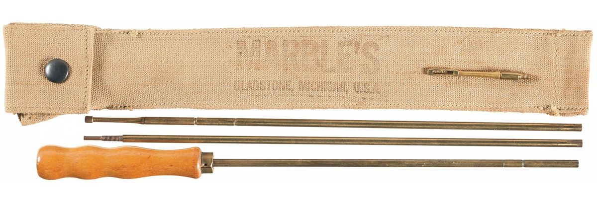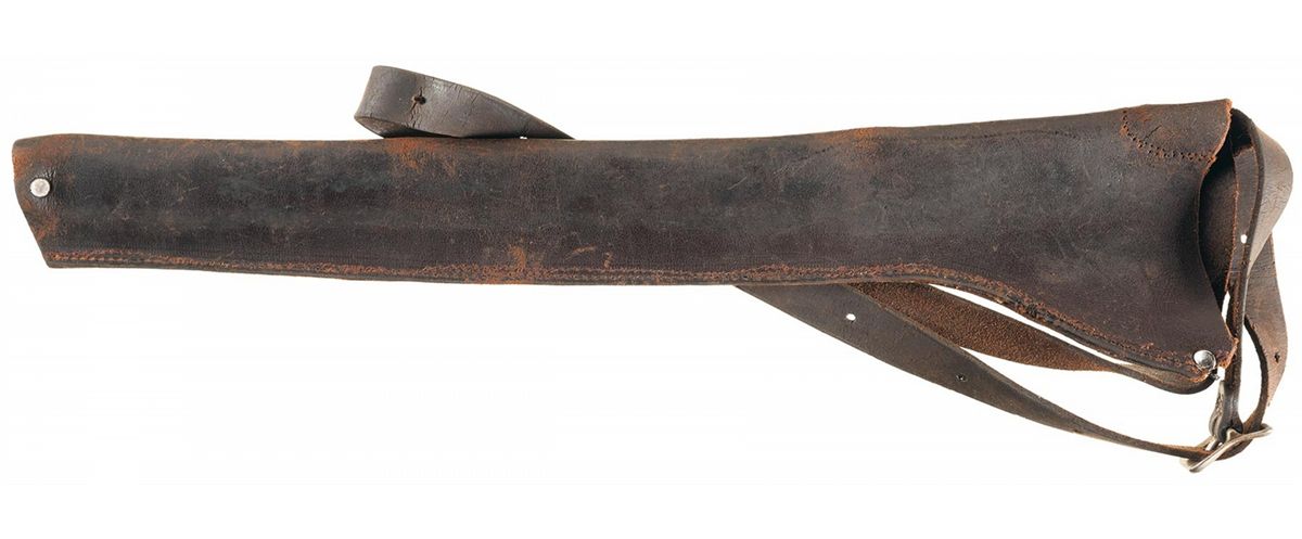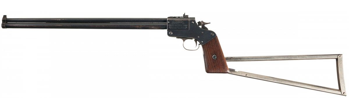 Manufactured between 1908 and 1955. Blade front sight and folding notch and peep rear sight with the caliber markings on the right side of the chamber block, "MARBLE'S/GAME GETTER GUN/MARBLE ARMS & MFG. CO./GLADSTONE, MICH. U.S.A." on the left and a conjoined "FM" in a diamond on the lug. Fitted with a casehardened hammer with swiveling striker, serrated trigger, smooth grips and a nickel finished folding stock. Included with the lot is a brown leather with adjustable strap and a canvas case with the Marbles address on the front and "OMO 1917" under the flap, containing a wood handled brass cleaning rod, two extensions and two head attachments.