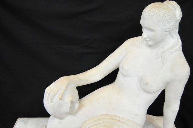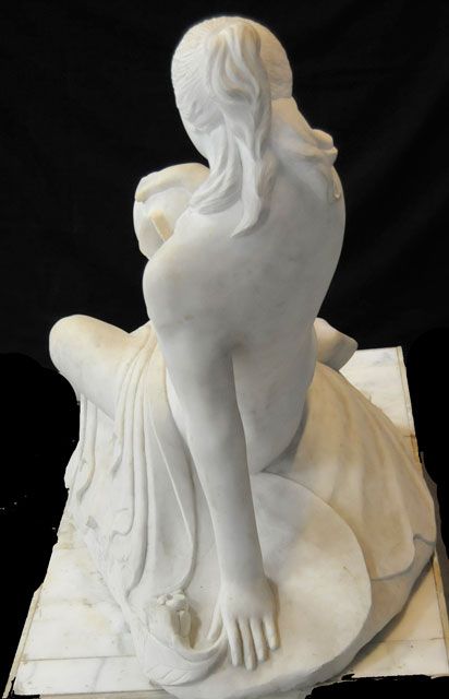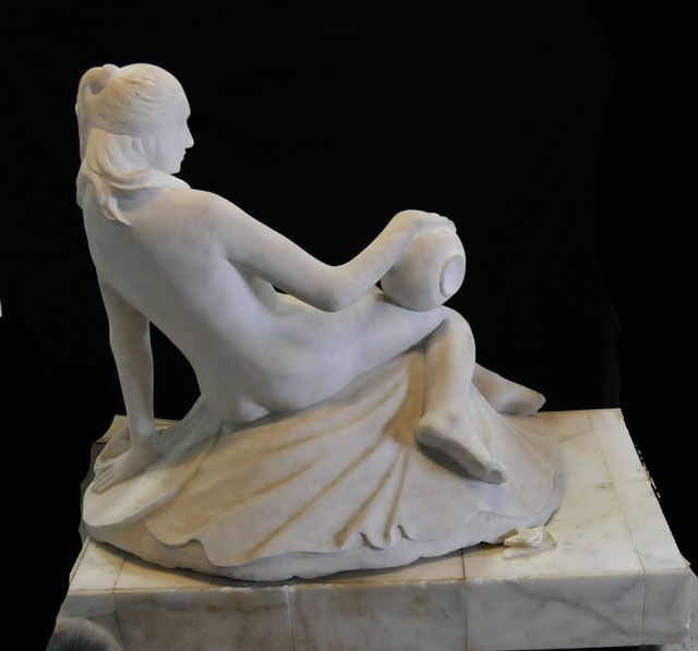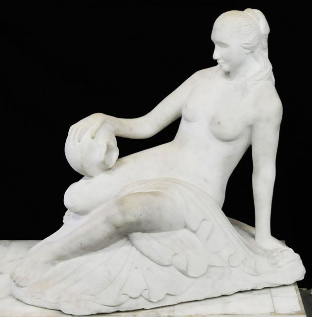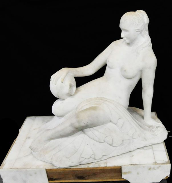 "Seated Woman with Urn on her Leg", some marble missing on base. Approx. 45" H x 43" W x 24.75" D. Please read our terms of sale.