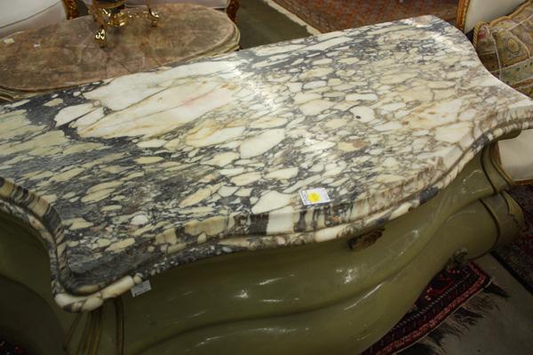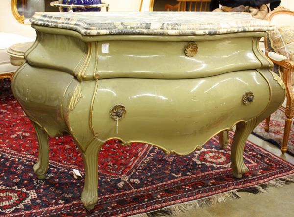Marble top bombe chest, having a serpentine top above the paint and partial gilt conforming case rising on stylized cabriole legs, 38''h x 60''w x 23''d