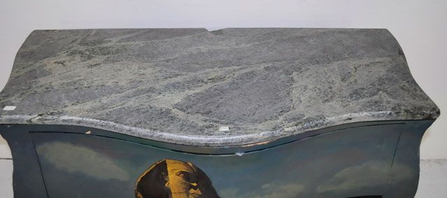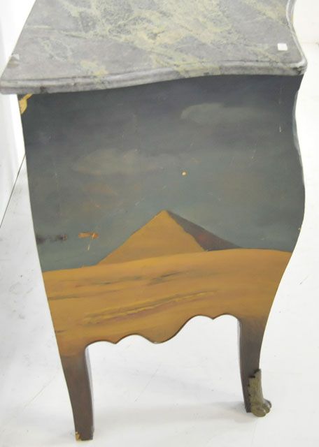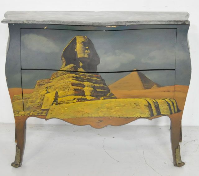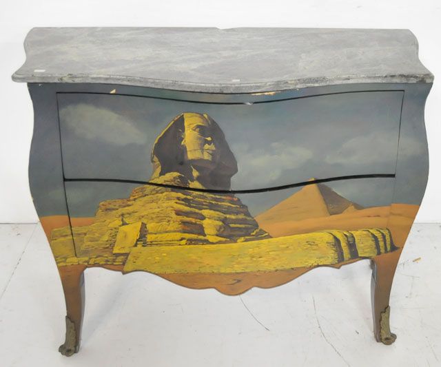 2 drawers, with Egyptian painting on front, bronze handles. Approx. 34" H x 45" W x 21" D. Please read our terms of sale.