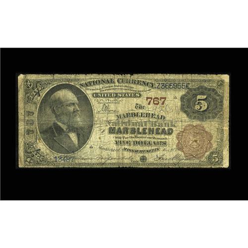 <B>Marblehead, MA</B></I> - $5 1882 Brown Back Fr. 467 <B>The Marblehead NB</B></I> Ch. # 767<BR>A scarce note from this avidly sought after community. <B>Good-Very Good,</B></I> with the back very well worn.