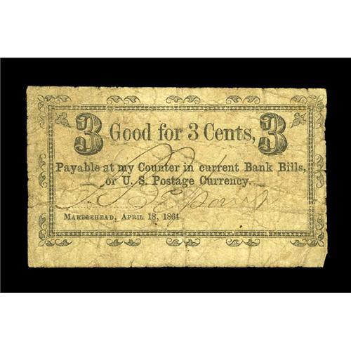 <B>Marblehead, MA- B. Epson, Jr.</B></I> 3¢ April 18, 1864<BR>A second example, with this piece, also payable in Postage Currency, showing the demand for such items when it realized $506 in our September, 1999 sale. <B>Fine.</B></I>