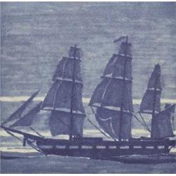 Good Marblehead tile, ship in blue against a blue and white matt glaze ground, impressed mark, paper labels, in an Arts & Crafts oak frame, 5.75”sq.
