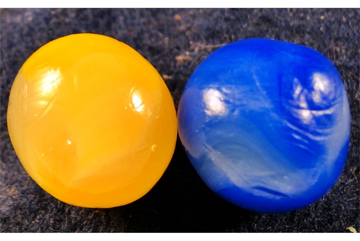 AKRO AGATE COMPANY, Double Ingot. Lot of two marbles. Both are double ingot Royals. A double ingot is where two marbles stick together coming into the rollers and so are formed together. They are out of round, but this is because the twice as much glass was in the roller as should have been and the diameter of the roller was too small to accomodate it. Clarksburg WV, circa 1925-1935. 25/32". Mint (9.7).