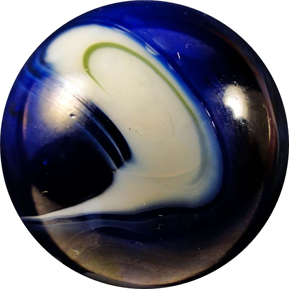 AKRO AGATE COMPANY, Slag. Large, rare Slag, in great condition. Blue Slag. Handgathered. Poorly formed "9" on the top and a tail. There is a green swirl in the white of the "9". This is very rare. Likely, a gob of green slag had been gathered just prior to this gob. A couple of tiny sparkles. In great shape and the extra color is very rare. Clarksburg WV, circa 1920-1925. 1-3/16". Mint(-) (9.2).