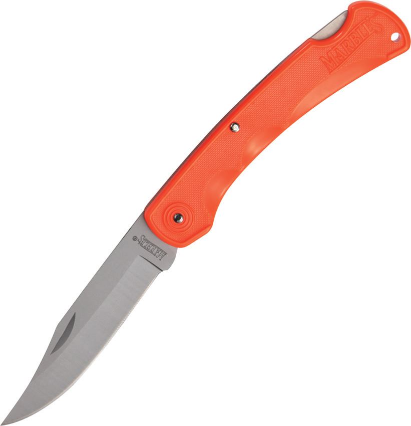 5" closed. 3 3/4" matte finish surgical steel clip point blade. Finger grooved orange composition handles. Lanyard hole. Embroidered black nylon belt sheath.