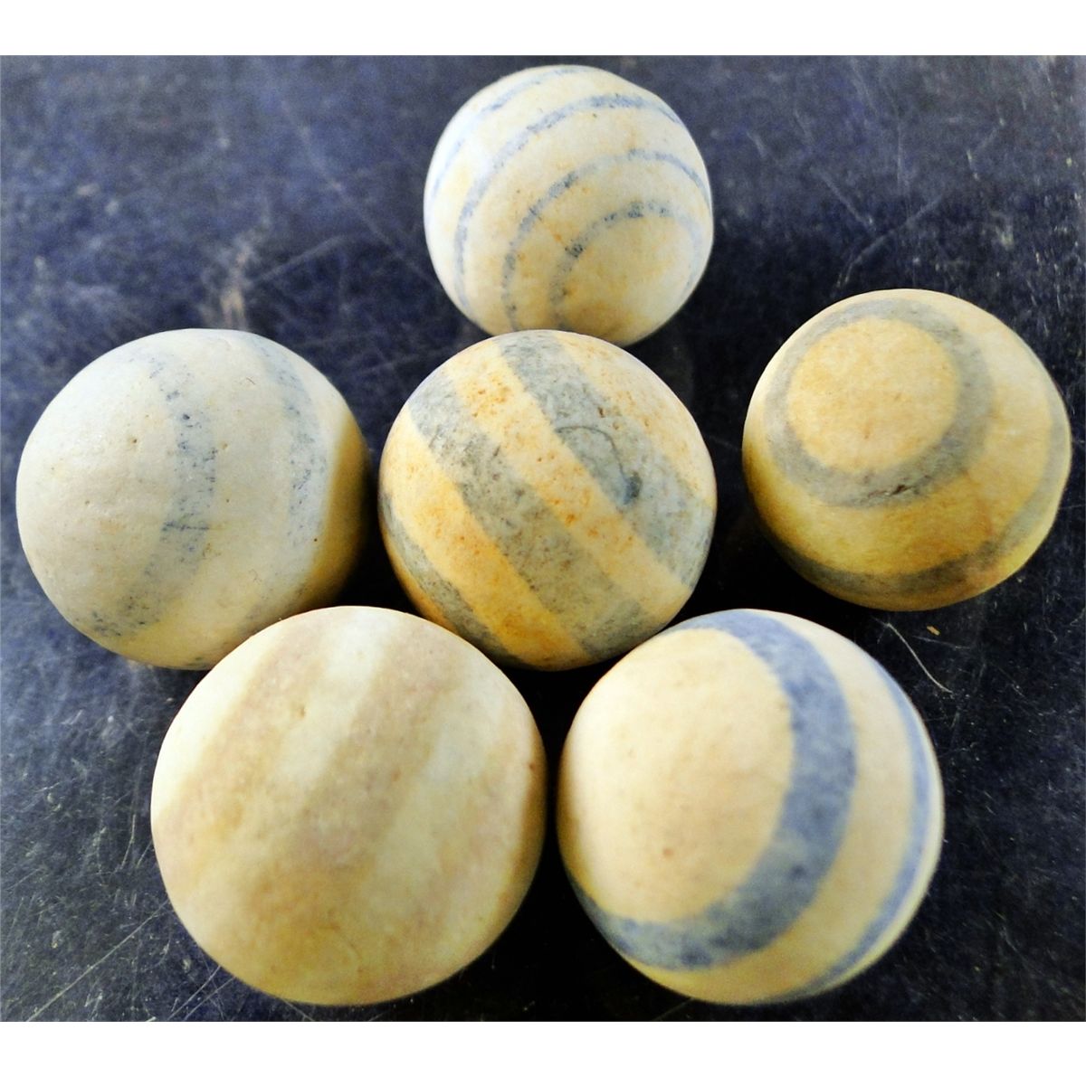 NON-GLASS HANDMADE, China. Lot of six marbles. All are unglazed chinas. All with concentric rings. Nice set, hard to find designs. Germany, circa 1850-1920. 23/32". Mint (9.9). Provenance: Accompanied by a COA from LandofMarbles.com authenticating that this marble was recovered from a shipwreck off Long Island. The marble are in as-found condition, no reconditioning has occurred. .
